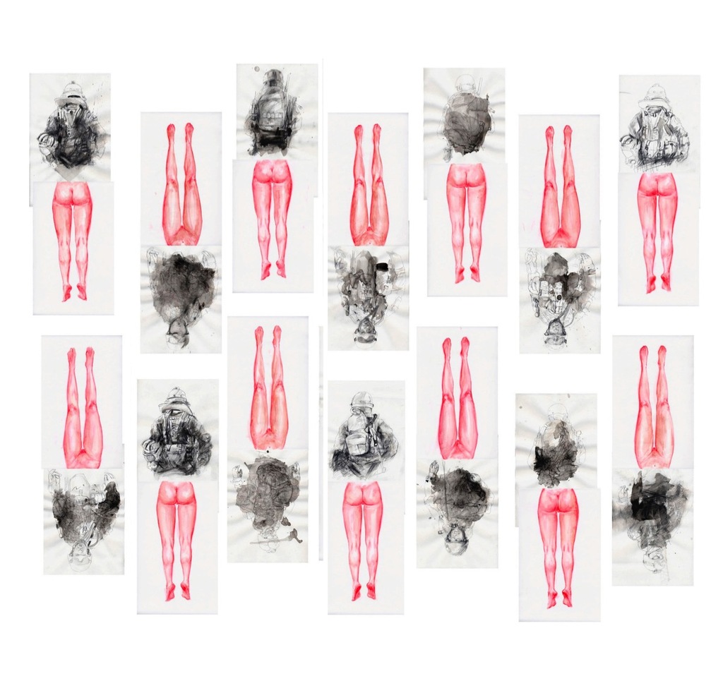 Il soldato in bianco e nero, nella sua tagliente drammaticità, ricorda la forza bruta e ci rimanda alla guerra in tutta la sua cinica visione. Il sesso e le gambe di donna invece, aggraziate ed invitanti, dai rosa esasperati di un kitsch pornografico, ci trasportano in una dimensione sensuale in cui non è possibile resistere alla tentazione.