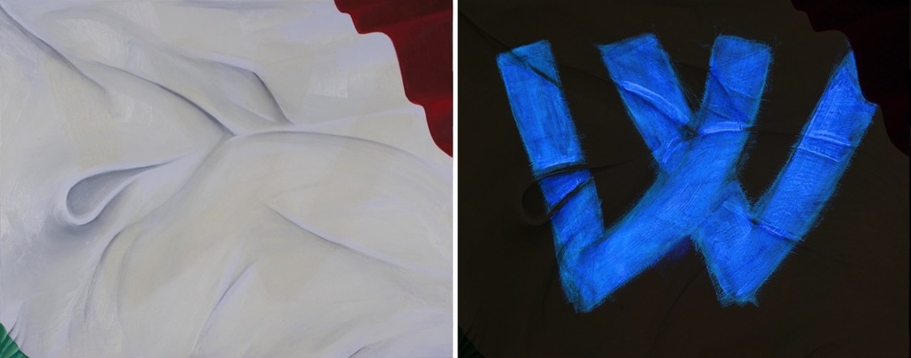 “GIORNO E NOTTE” 2011 - 100x80 - olio, gel fosforescente su tela, visibile anche al buio.