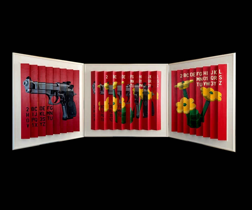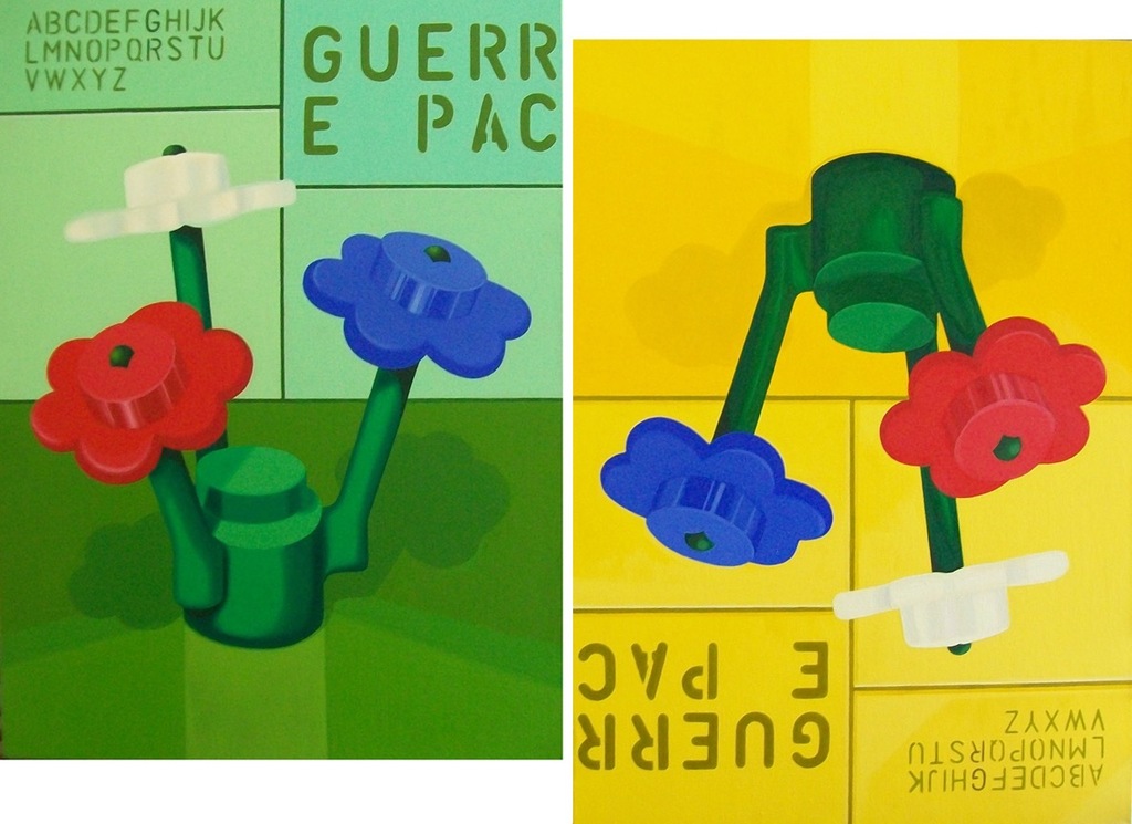 La scelta delle immagini raffigurate come mio solito è la ricerca della sintesi, con una sola immagine l’osservatore dovrà capire immediatamente quello che voglio rappresentare, ma in contrapposizione all’immediatezza della raffigurazione c’è la curiosità la ricerca ed il divertimento di scoprire quello che non è immediato come in questo caso il titolo dell’opera, individuabile solo dopo una semplice ma pur sempre attenta analisi delle lettere raffigurate, il tutto allo scopo di far interagire l’osservatore come in una sorta di opera concettuale per creare interesse e divertimento, a tal scopo anche la scelta del punto di osservazione, voluto per creare diversità se pensiamo che solitamente un quadro ha solo il punto di osservazione frontale, una scultura ha un punto di osservazione a tuttotondo, con guerra e pace è stata creata una terza possibilità, l’osservatore pur stando davanti all’opera scoprirà che spostandosi da un lato potrà vedere soltanto guerra e solo ed esclusivamente dall’altro lato potrà vedere pace, due quadri indipendenti nettamente distinti tra di loro ma allo stesso tempo uniti grazie alla progettazione ed alla personale creazione di una particolare ed originale struttura in legno tutta da vedere.