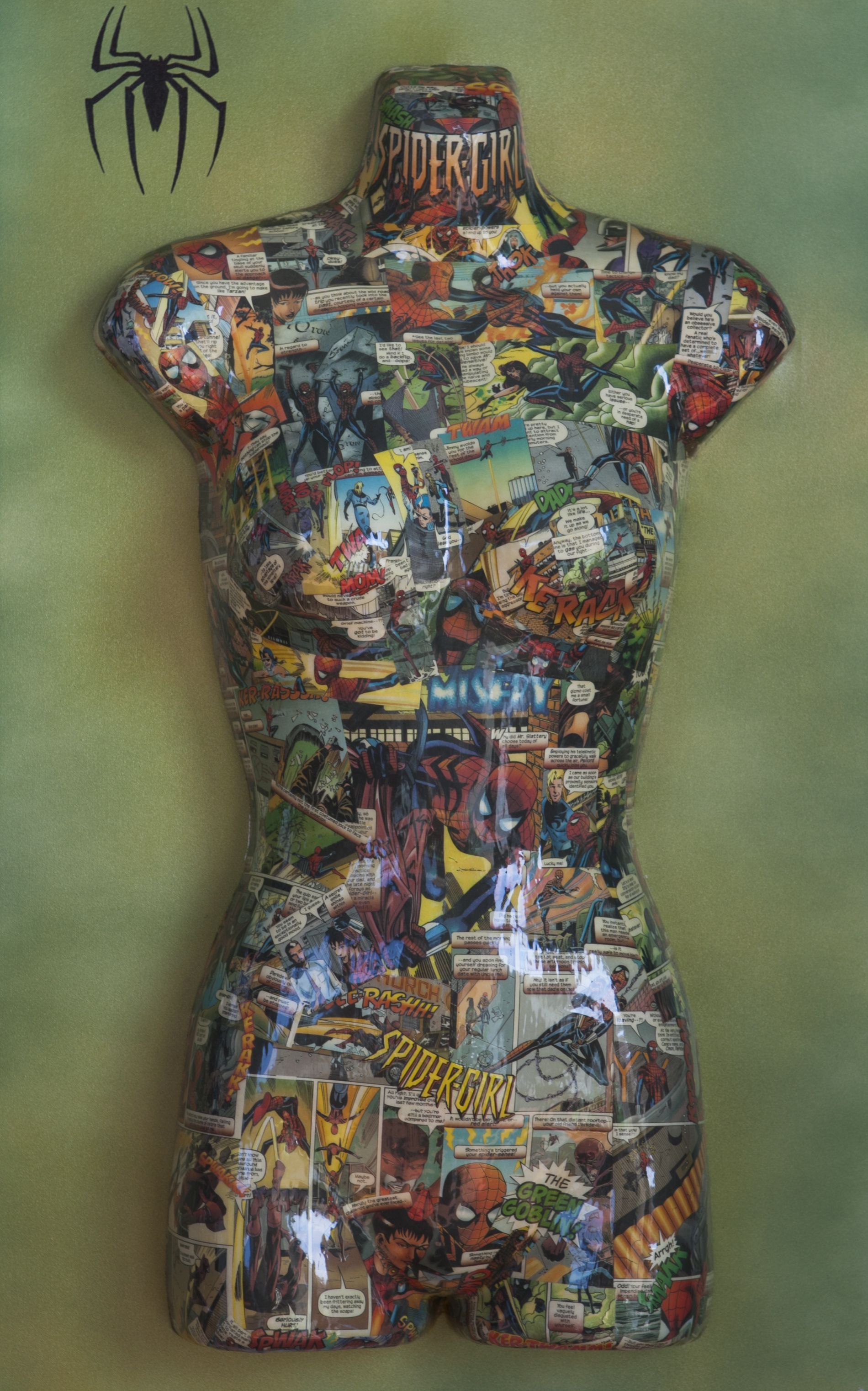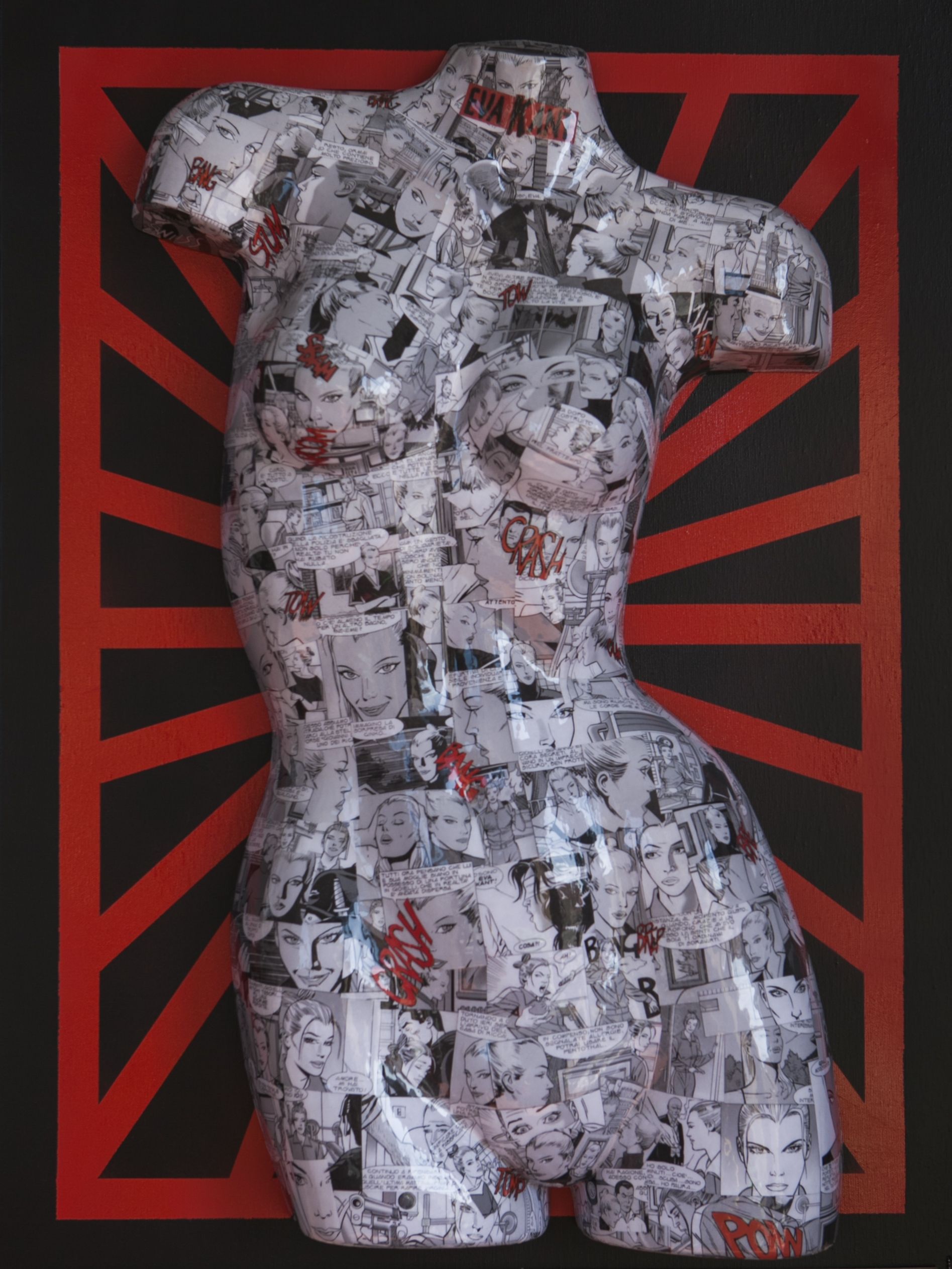 Busto di manichino,ricoperto con tecnica collage,montato su tela dipinta a smalto. Le creazioni di Carolina Art Design lasciano veramente senza parole,in effetti noi tutti parlando d’arte abbiamo dei riferimenti per lo più neo classici o metafisici,che pur sempre ci conducono in una strada già percorsa e ripercorsa in più periodi temporali e da svariati maestri delle varie epoche e scuole.Questa direi che è una nuova tendenza,una espressione modernissima che sta caratterizzando personalizzando e rigenerando oggettistica,vecchi tavoli mobili e non solo,dando un volto diverso a tante cose di tutti i giorni che ci appartengono e di cui tutti facciamo uso.E’un pò come educare al loro riutilizzo facendone attraversare da un epoca ad un altra con rinnovato gusto e design. Francesca Berti Critica d’Arte