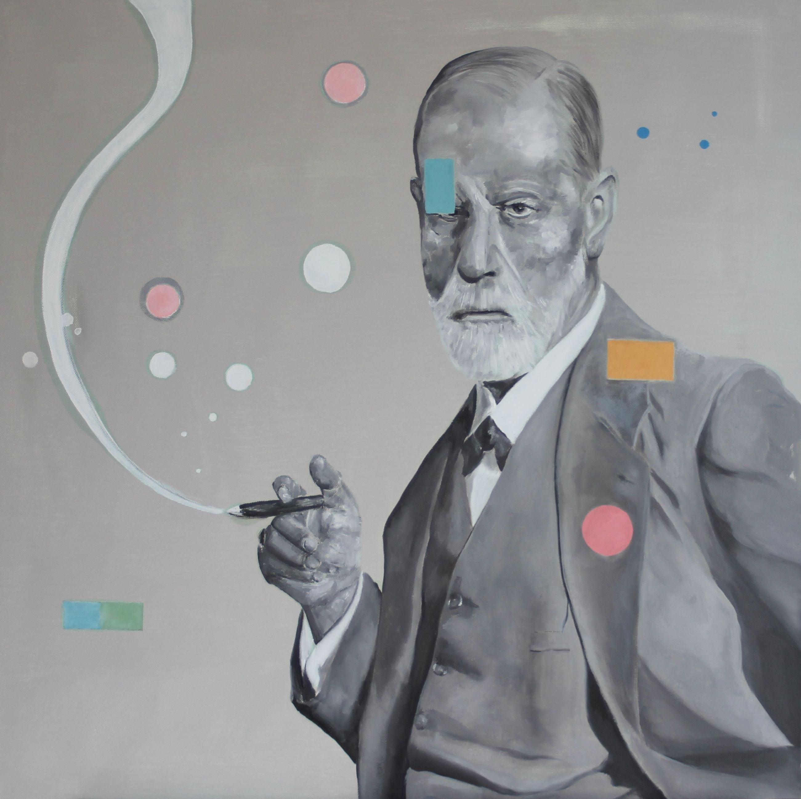 Lo Sciamano - l’opera vuole essere un omaggio pittorico a una figura chiave del XX secolo, colui che ha portato la luce della ragione nell’esplorazione dell’inconscio. Ho voluto sottolineare il parallelo con la pratica pittorica che cerca di afferrare la luce per mostrare la bellezza e la complessità dell’universo fuori e dentro di noi, svolgendo un’analoga funzione terapeutica. Per questo il sigaro di Freud è già un pennello che con lampi di luce e di colore evoca l’apparizione del nipote Lucian.