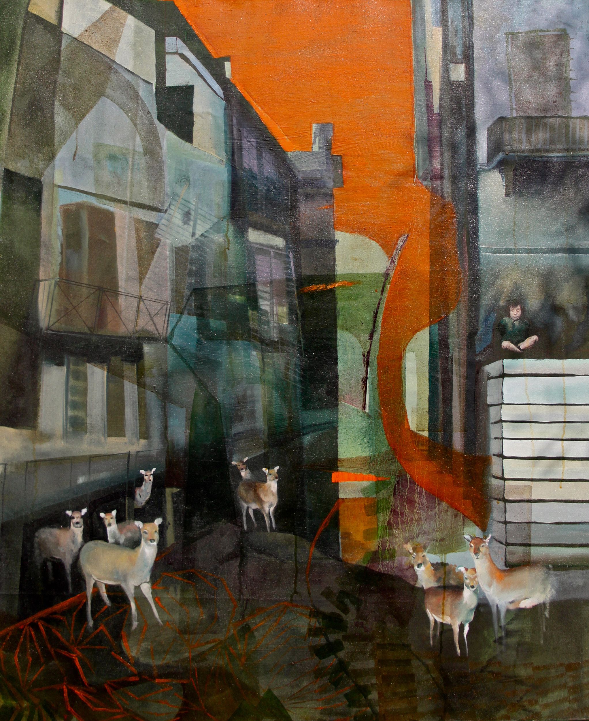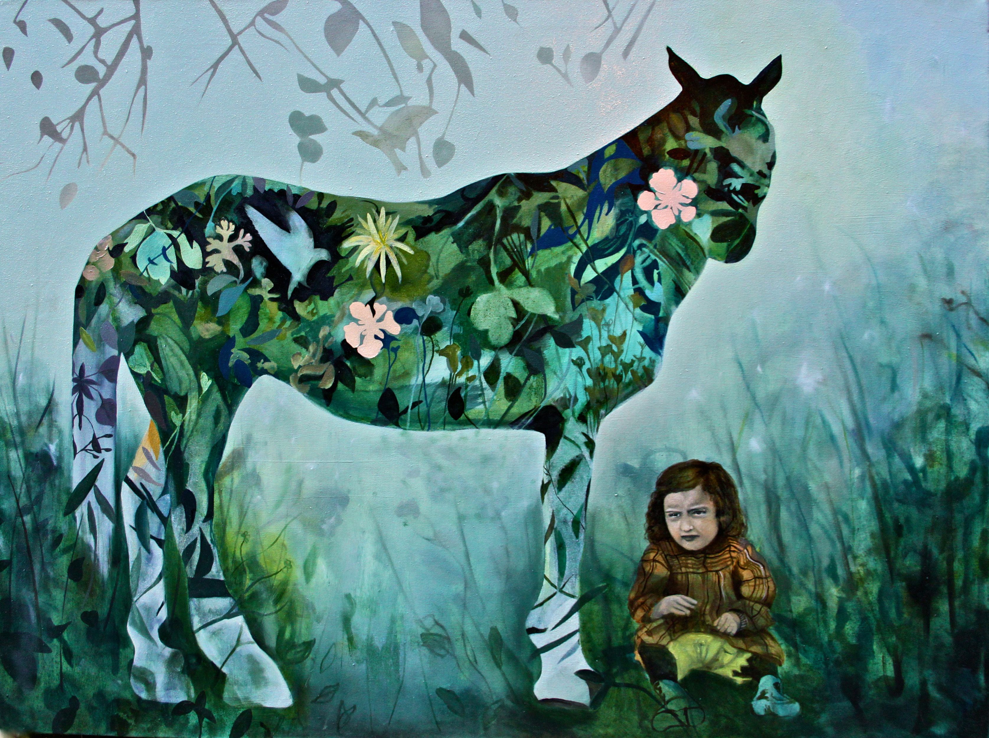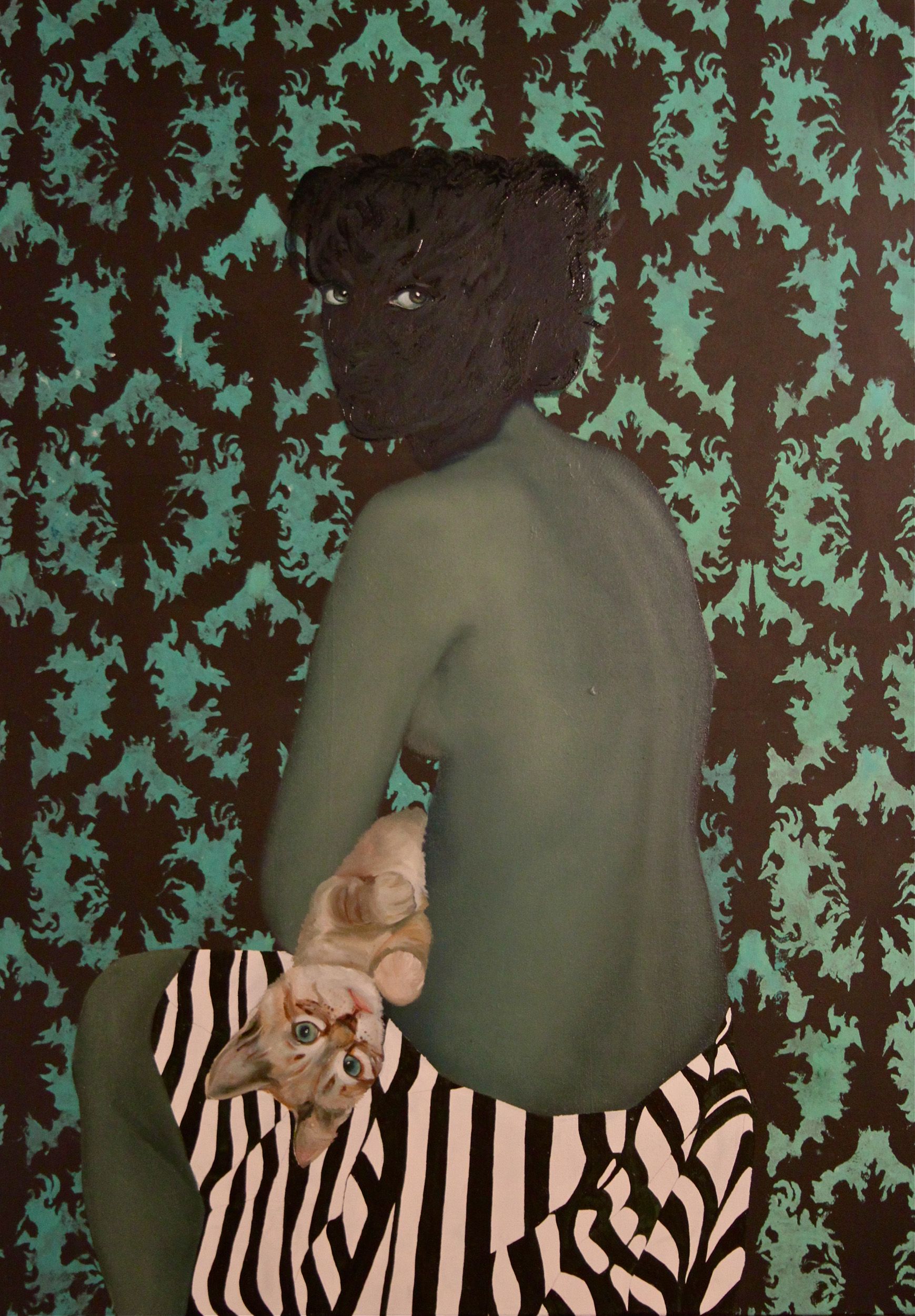 In questo dipinto, come in altri miei lavori, ho voluto esprimere la drammaticità degli elementi presenti attraverso lo sguardo assente e vuoto che li caratterizza. Sia i gatti che la bambina, si trovano in qualche modo estrapolati dal contesto dal quale provengono e costretti a convivere, intrappolati nella tela.