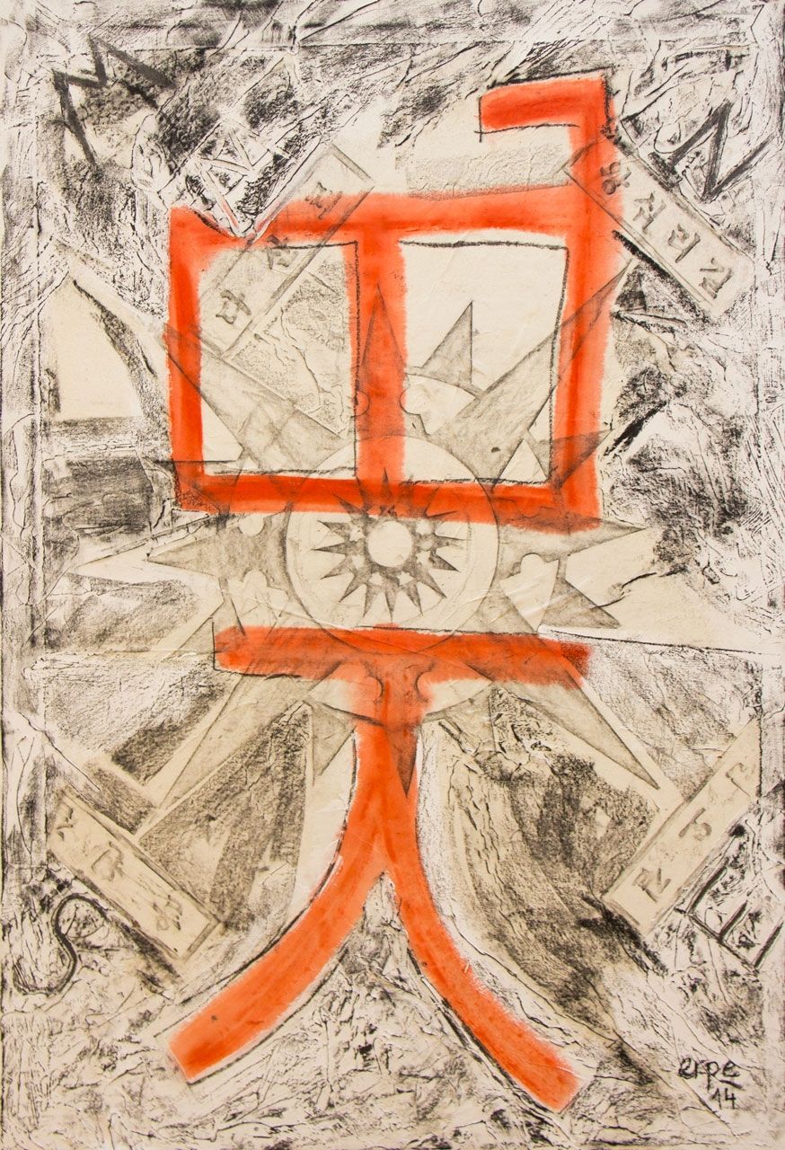Erpe started the TERRAIN-cycle with a sort of prints - frottage - from inscriptions and other elevated shapes in the streets of Asia, and went on with prints made in all countries erpe visited. She used only papers made in these countries. As a collage on canvas these prints were the first layer for mixed media artworks. The paintings show both the clear prints of inscriptions and emblems of the visited towns, streets and roads and elements of landscapes of the famous Asian gardens.