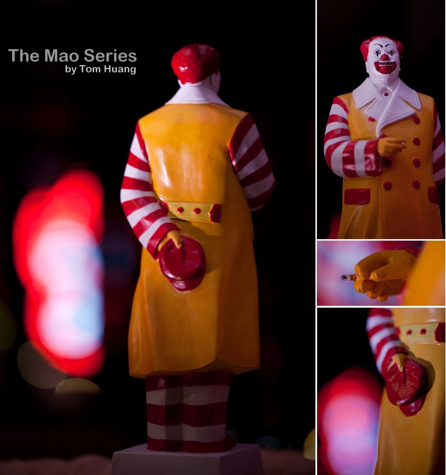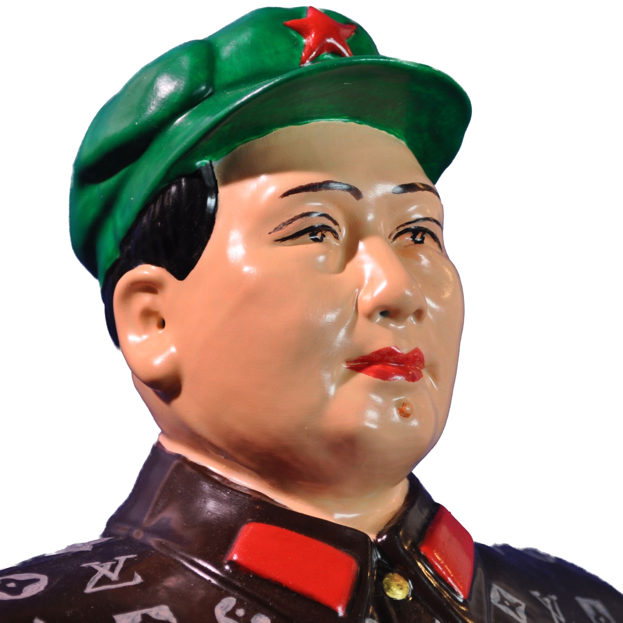 Still a communist country by name China transformed in many aspects to become a capitalistic society. The value set, the way factories are operated, consumerism and brand awareness, the value of material possessions & money. The gap between the fiction of the party’s rhetoric (“China is a socialist country”) and the reality of everyday life grows larger every day. How would the ”Great” Chairman react ? What would he wear at work ? Tom Huang is playing in his recent work with the iconic symbols of the Cultural Revolution (the mass produced white ceramic Mao Busts) and symbols of western brands. Dressing up Chairman Mao turned out to be a confrontation of ideology with reality. Luxury icons of western consumption come to stand for everything he opposed. Yet his cadres of the 21st Century not only produce most of them, they also queue to consume them. Chairman Mao in a western coat (with Louis Vuitton, Gucci, Prada or Mac Donalds clothing) is by 2015 only on the second look a disturbing sight. A sight which invites both cultures to reflect on their values and transformation.