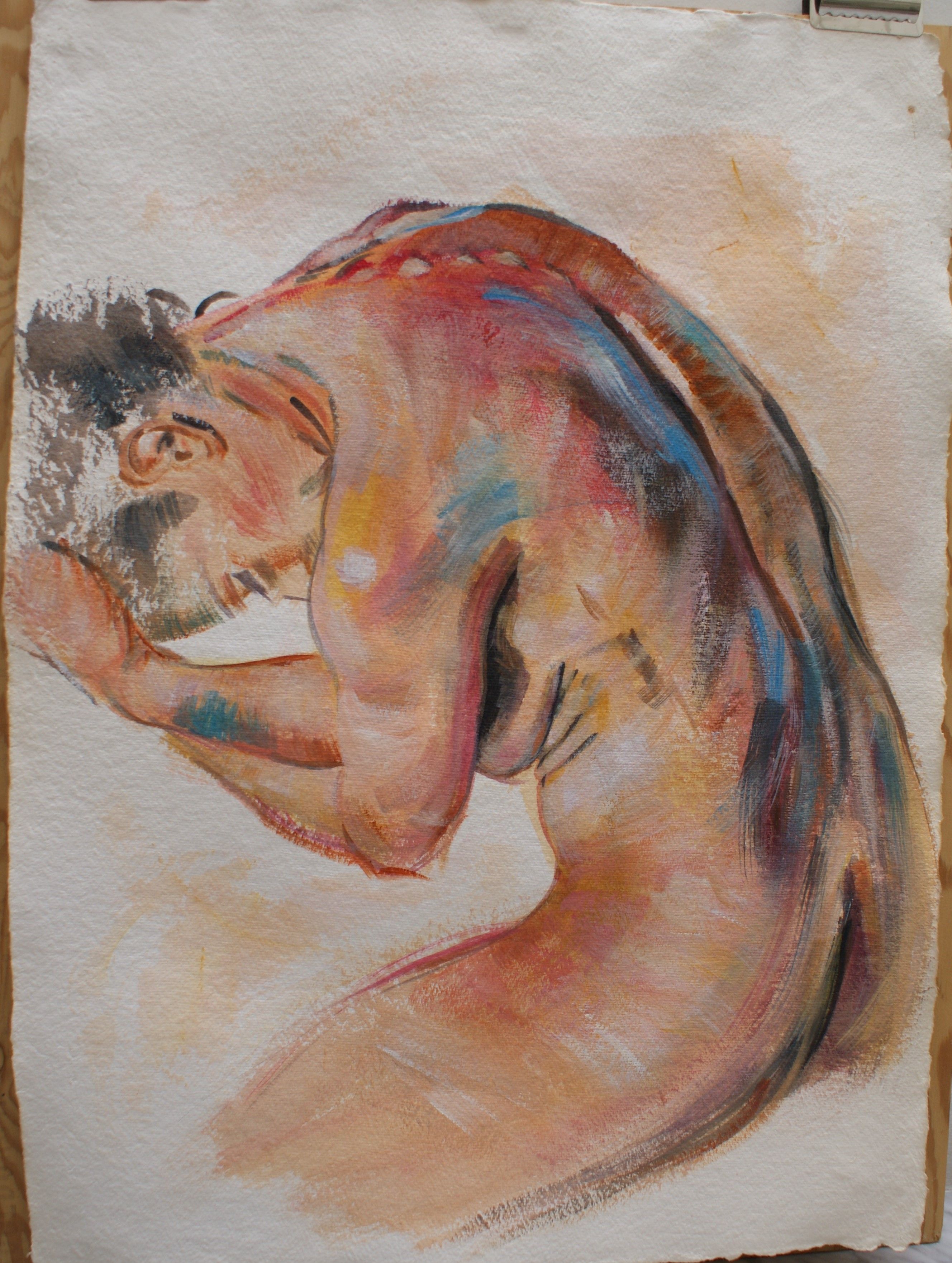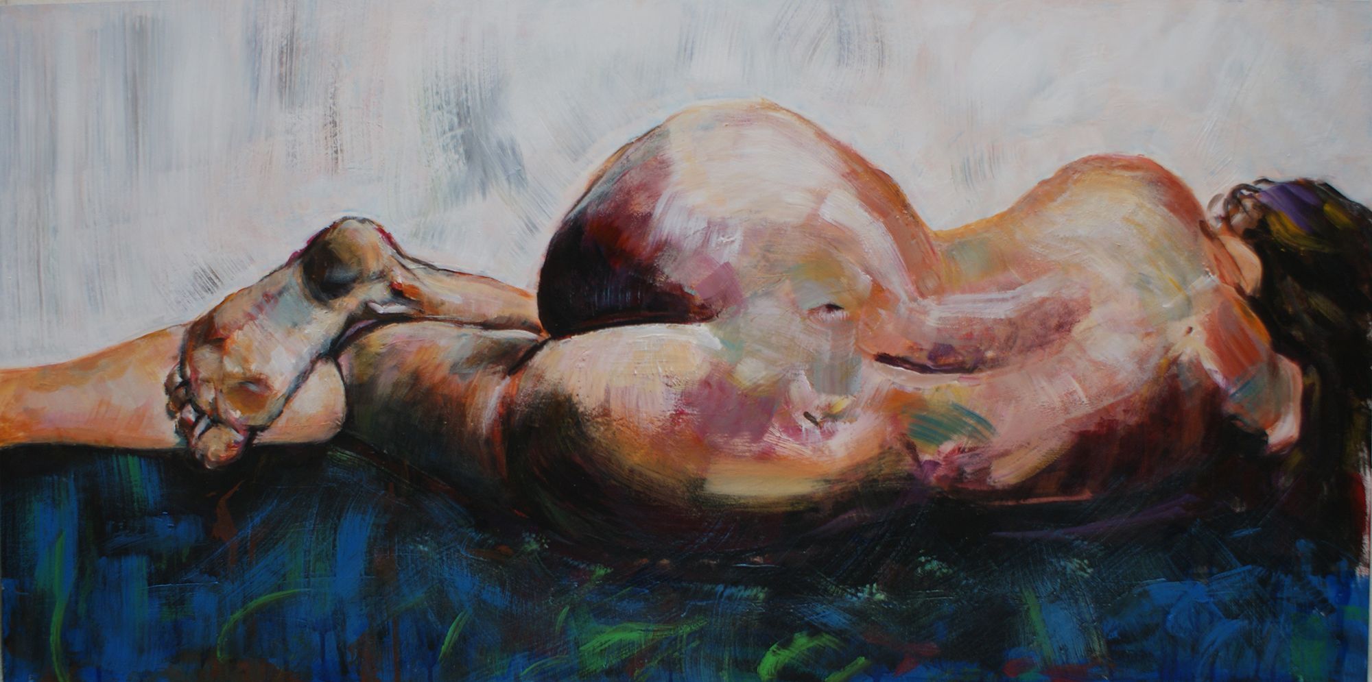 Sono sempre stata interessata alla figura umana, al corpo, maschile e femminile, capace di esprimere cio’ che si ha dentro. Questa opera rappresenta semplicemente la figura di una donna che si concede un attimo di riposo sdraiandosi nuda su un prato e sentendosi libera di farlo.