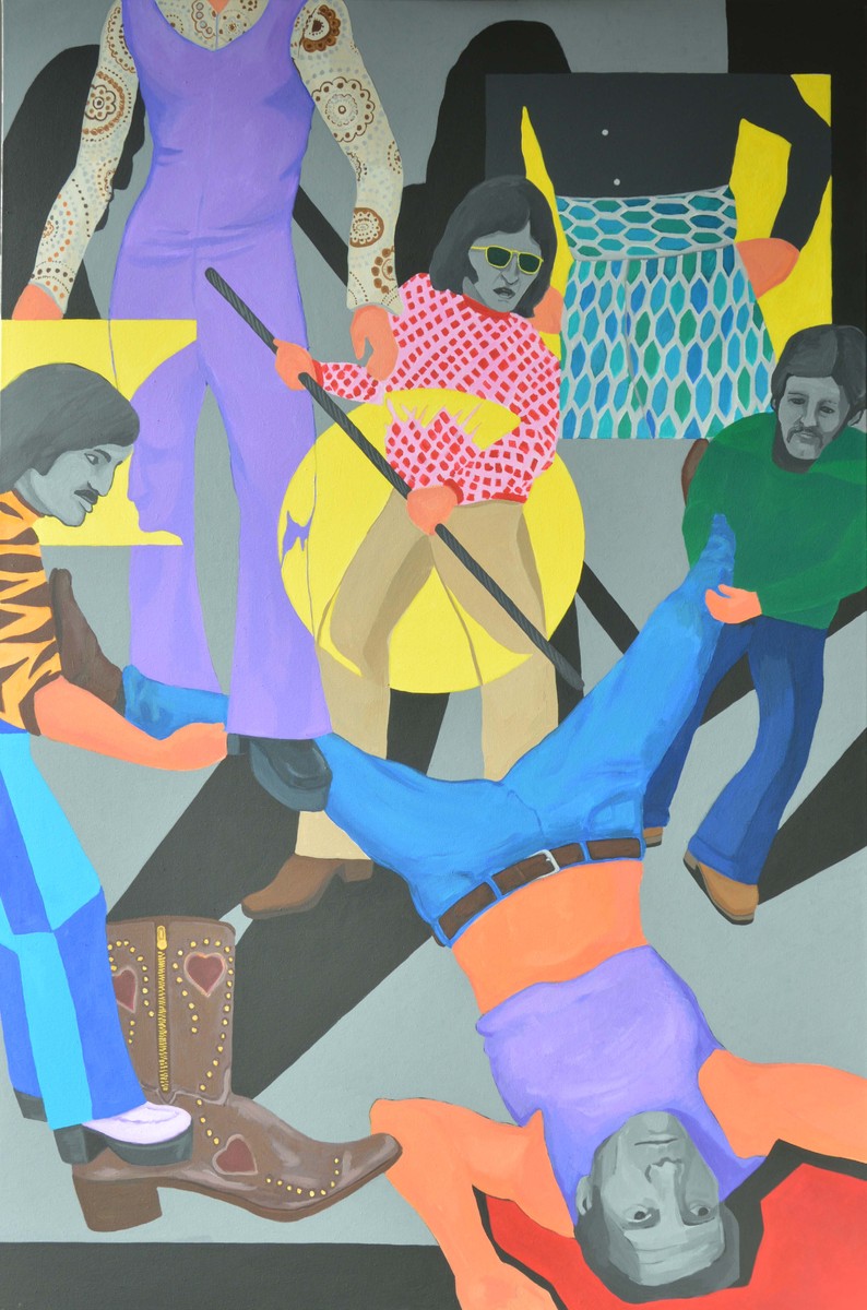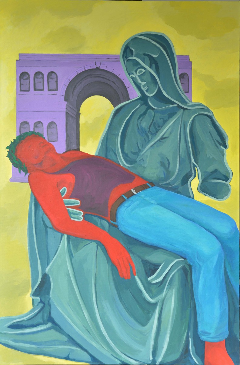 Nel quadro ho cercato di descrivere i meccanismi della Macchinazione, la mano ossea che indirizza il percorso dell’azione con una linea rossa tratteggiata, che scendendo dall’alto si fa strada immersa in un verde petrolio ad azionare la ruota-volano posta centralmente e che, a sua volta muove i diversi ingranaggi di un motore, come l’albero a camme, i pistoni e infine il pneumatico, proseguendo la discesa in diagonale, la linea arriva fino al corpo del poeta adagiato sul terreno, sopra di lui il muso dell’Alfa GT usata per il sormontamento, accanto un ufficiale delle forze dell’ordine chino sul cadavere; sullo sfondo in un giallo baluginante le baracche dell’idroscalo di Ostia, dove in un tempietto stanno sagome di statue-presenti al ritrovamento del corpo del poeta morto.