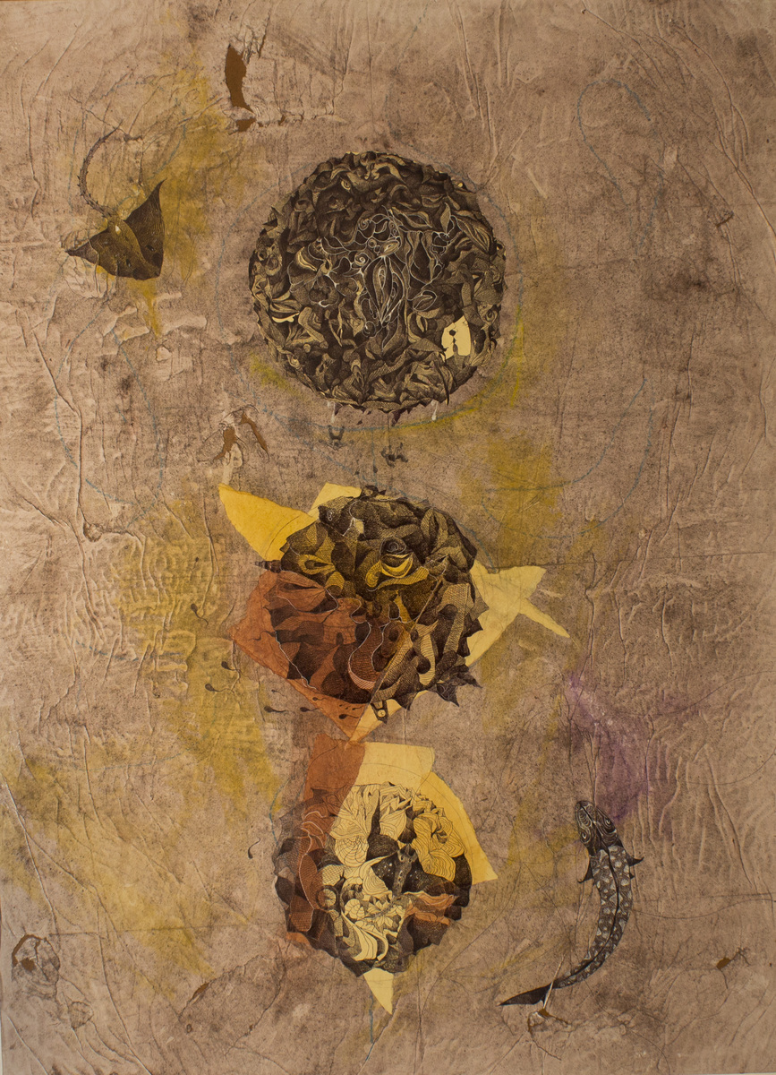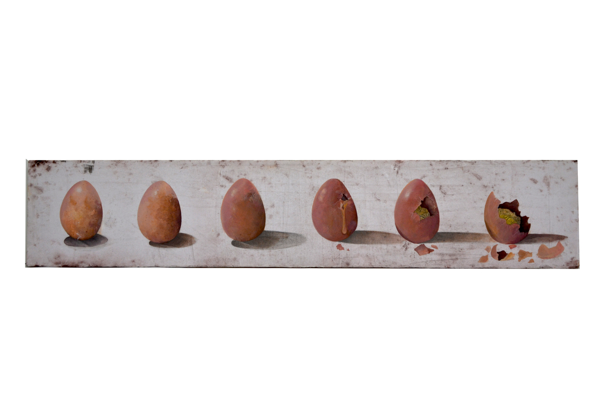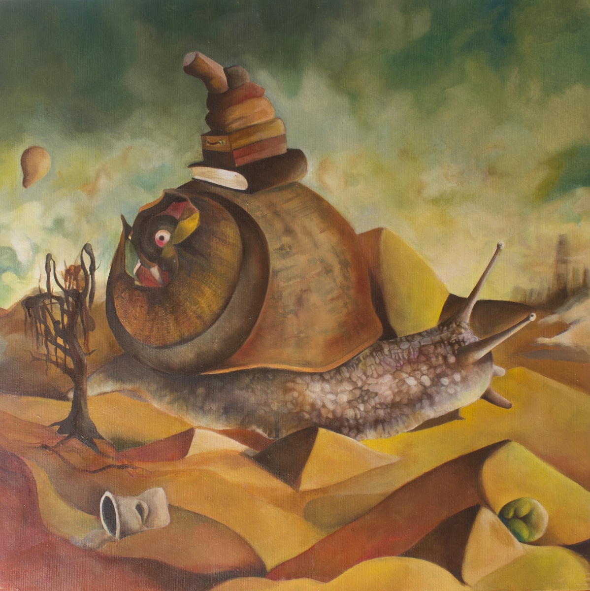 L’opera presentata è realizzata ad olio su di una superficie cartacea applicata su tavola di legno multistrato spessa 1,5 cm. In essa sono presenti molteplici dettagli leggibili in chiave simbolica e surreale; una chiocciola attraversa una landa deserta priva di acqua ( elemento vitale per questo animale ) consapevole del lungo percorso che dovrà attraversare per raggiungere la sua meta, quest’ultima è rappresentata in lontananza, sulla destra del dipinto, sotto forma di città sormontata da grosse nuvole grigie. Il futuro incerto e difficoltoso, che quotidianamente la maggior parte dei miei coetanei è costretto a percepire, è la chiave di lettura di quest’opera. L’animale porta sul suo guscio una pila di libri, dei dischi, valigie e vecchi album da disegno, allegoria del background culturale di chi si addentra nell’intricato mondo post universitario odierno. L’opera è stata concepita seguendo i concetti basilari del surrealismo e della tecnica dell’automatismo psichico, infatti ho disegnato istintivamente un precedente bozzetto senza una precisa intuizione ed in seguito ne ho individuato il significato e perfezionato la composizione nella fase esecutiva finale. / BIOGRAFIA Stefano Capozzo nato ad Acquaviva delle Fonti (Ba) il 31 Maggio 1990, ha conseguito il titolo di laurea con il massimo dei voti presso l’Accademia di Belle Arti di Bari seguendo il corso di Decorazione. Completa il percorso di studi con le tesi dal titolo: ”Animazione a passo uno e claymation” nel triennio e ”La fabbrica dell’arte e gli animali nella pittura” nel biennio specialistico focalizzando la sua ricerca sulle tecniche pittoriche antiche e contemporanee. Partecipa attivamente a numerosi