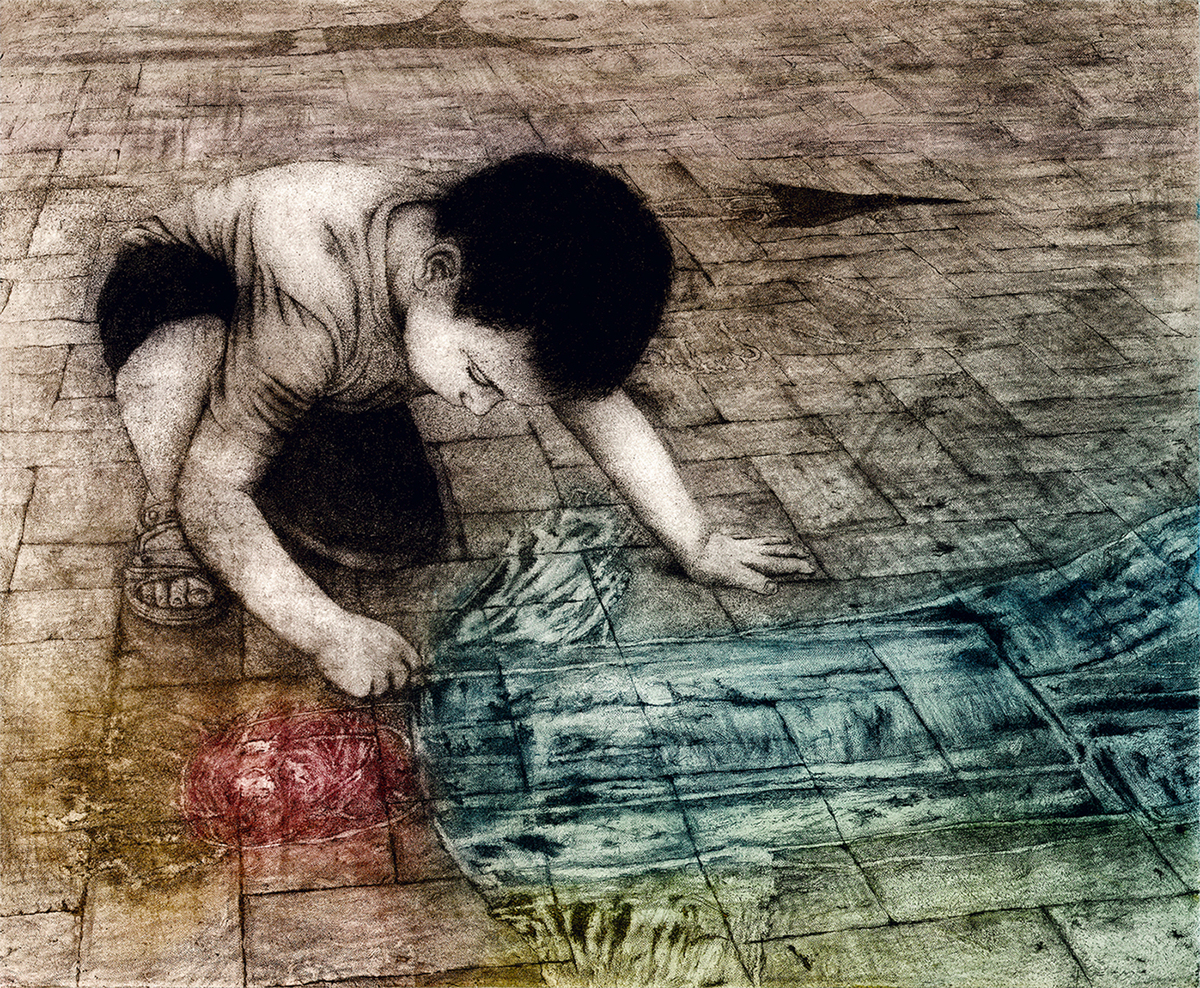 La tecnica con cui è stata realizzata appartiene al campo dell’incisione sperimentale che punta a una maggiore ”pittoricità” utilizzando per le matrici materiali della moderna tecnologia con sistemi atossici che si preoccupano della salvaguardia dell’ambiente e del benessere di chi le utilizza. Il procedimento di stampa continua ad avvalersi del torchio calcografico ma, il foglio appena impresso, viene ulteriormente ”trattato” per mezzo di pennelli giapponesi dalle setole larghe e morbide, al fine di ottenerne il risultato finale. Sebbene ci sia una lastra di partenza, ogni opera stampata con questa modalità è un pezzo UNICO perché, la combinazione ”alchemica” tra i vari elementi, rende impossibile riprodurle alla medesima maniera. In sintesi, pur restando all’interno dell’incisione, la tecnica stessa viene ”distrutta” nel suo principio base della perfetta molteplicità.
