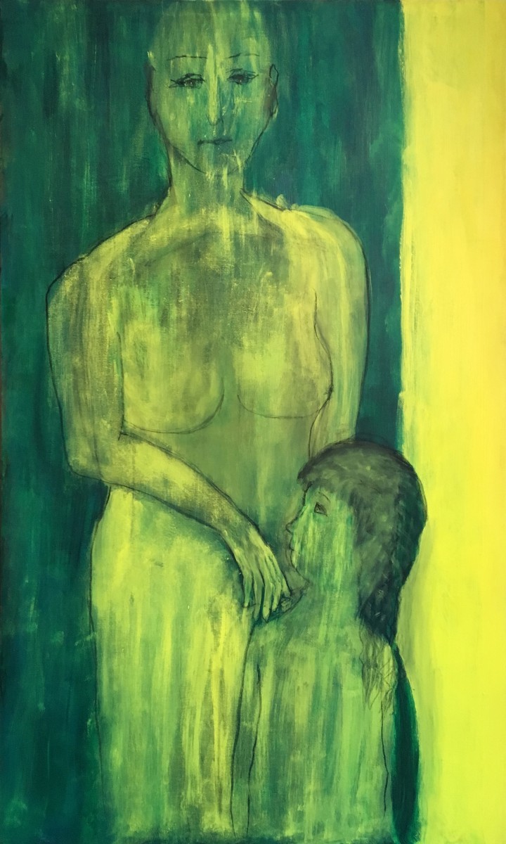 In una luce irreale, quelle dell’aurora boreale che ho visto in Norvegia, si materializzano due figure: una madre con uno sguardo fisso che, mentre cerca sua figlia con la mano, guarda altrove e sotto una bambina che guarda sua madre con uno sguardo triste una domanda negli occhi, chiedendosi perché?Vivo e lavoro a Milano; dopo essermi laureata in Architettura presso il Politecnico di Milano, mi sono poi diplomata all’Accademia delle Belle Arti di Brera. Lavoro prevalentemente con acrilico, carboncino: colore e segno.