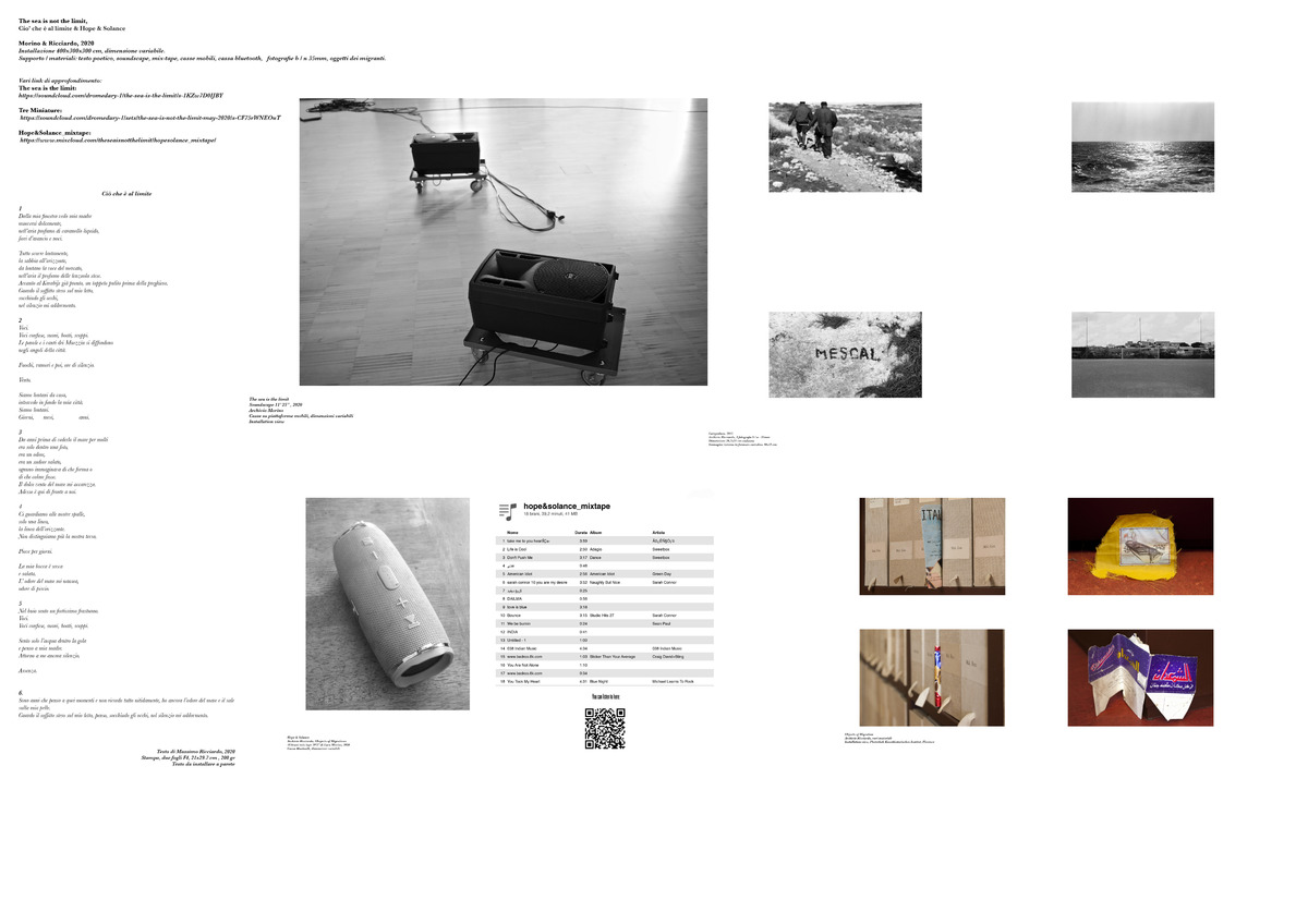 “The sea is not the limit” di Massimo Ricciardo e Luca Morino è un progetto aperto, in divenire, composto da una serie di suoni, testi, oggetti e immagini fotografiche realizzati o collezionati dagli autori nell’ambito di una ricerca legata allo spostamento, al viaggio e alle migrazioni.