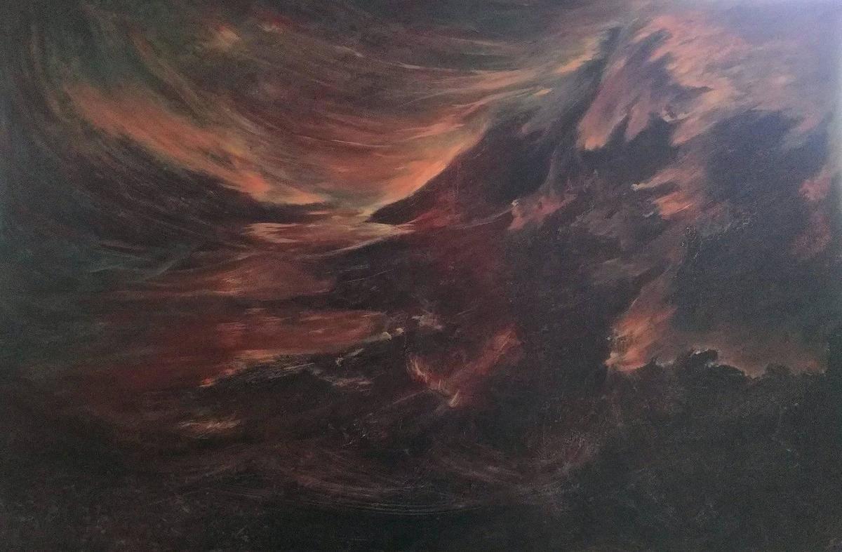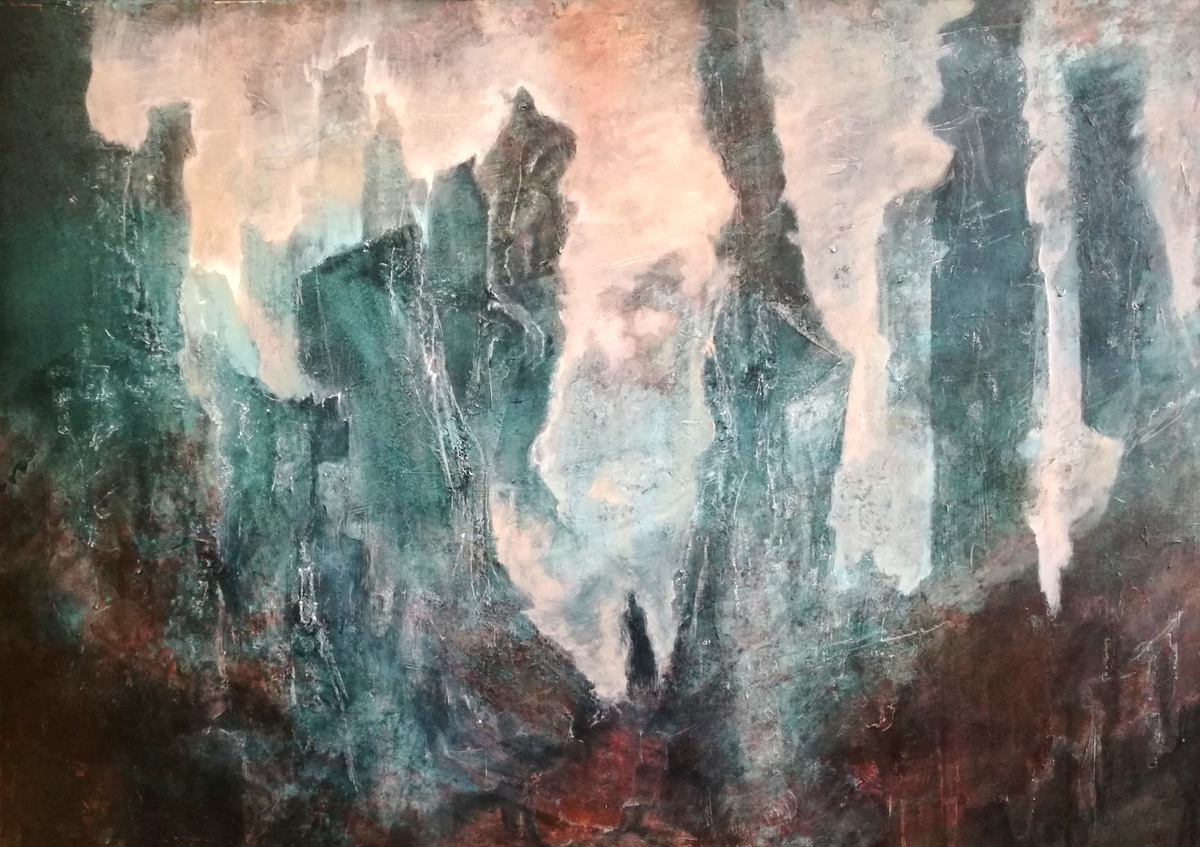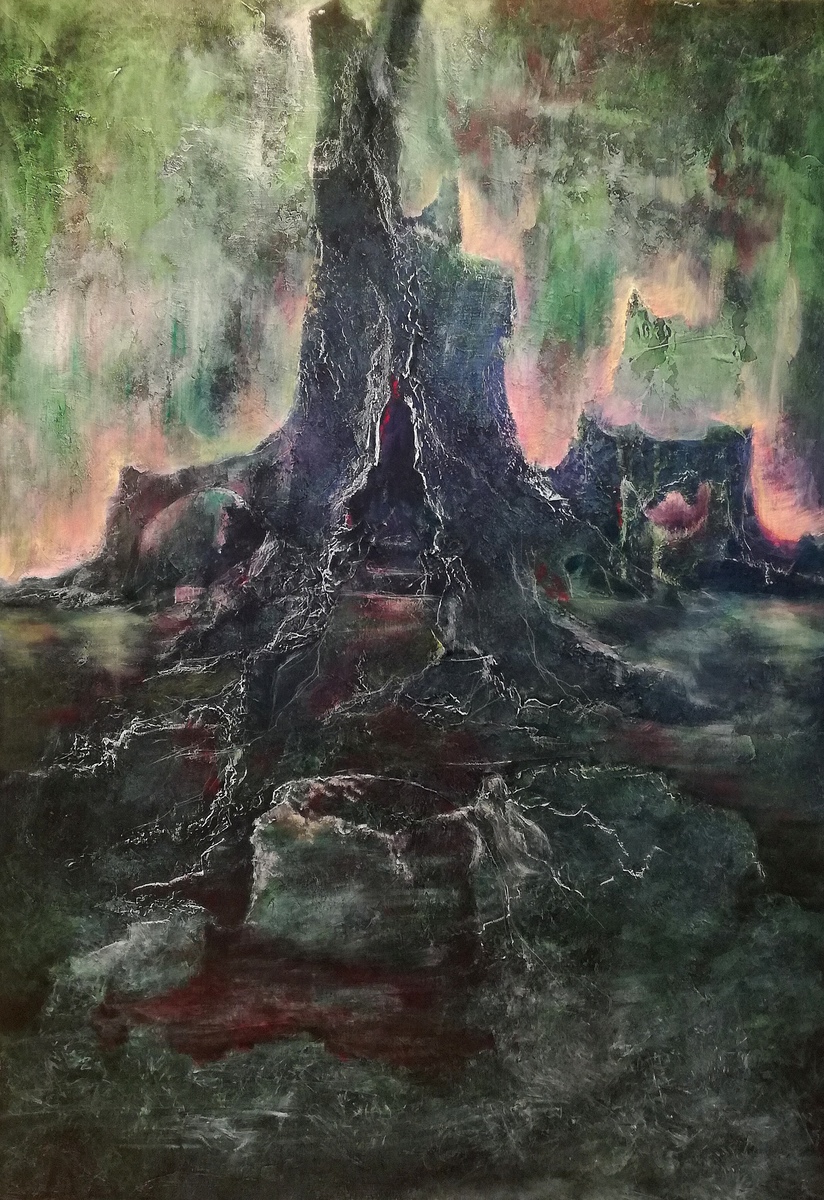 ”L’apprendista stregone” vuole rappresentare una forza creativa primordiale, un’esperienza artistica più che la trasposizione di essa. È il quarto lavoro di una serie di cinque, dal titolo ”La terra dei fantasmi”. L’artista non desidera fornire un’ulteriore descrizione del contenuto del quadro, per lasciare allo spettatore una lettura completamente autonoma e una risposta emotiva autentica. La genesi è strettamente legata al vissuto e alla psiche dell’artista.