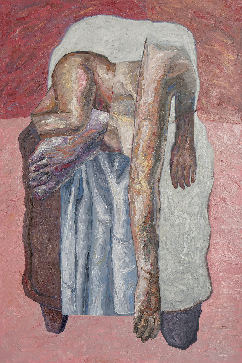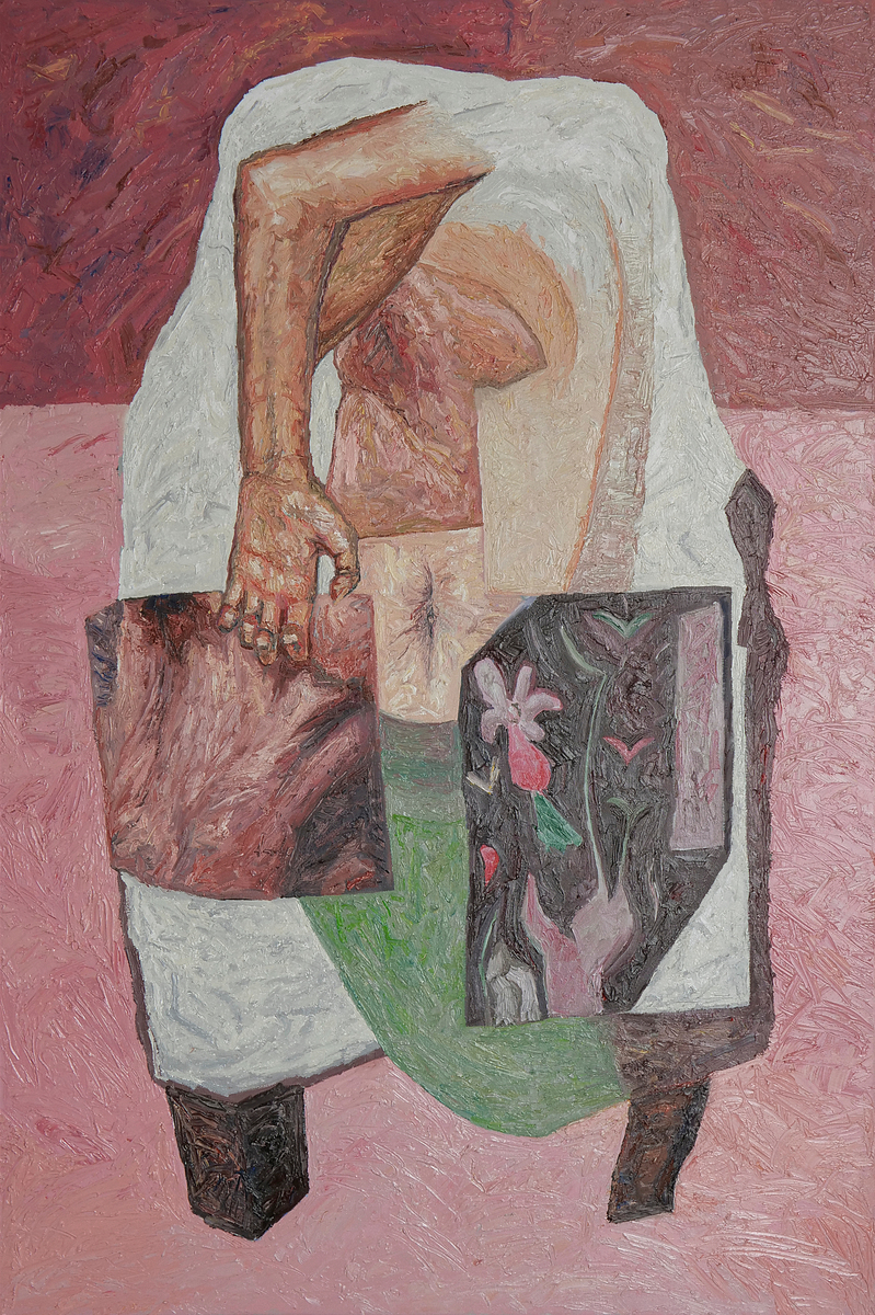 Il corpo è lo strumento comunicativo utilizzato per narrare il mondo interiore, in una composizione dinamica, accompagnato da elementi simbolici quali: una poltrona distorta, simbolo di ozio e riposo; un lenzuolo, simbolo di nuda intimità.