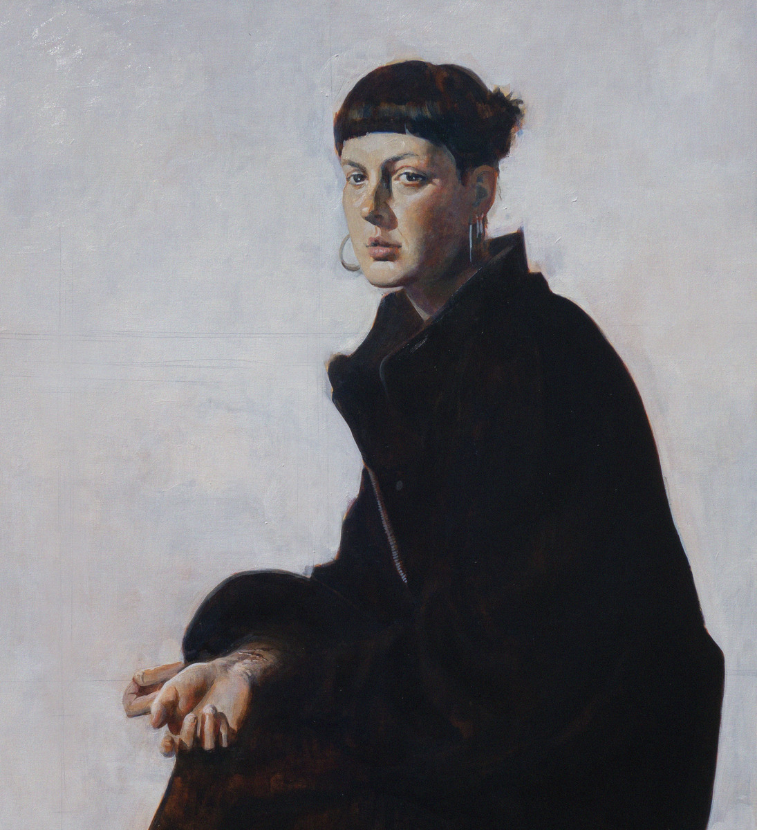 La tecnica usata per questo dipinto è quella della pittura a olio. Ho usato un’espressione più specifica per mostrare direttamente tutti i dettagli, usando quasi solo il bianco e il nero, senza sfondo e senza ombre. Vorrei creare un collegamento psicologico il più diretto possibile con gli spettatori proprio perché gli autoritratti sono un tipo di autoesame, di auto-osservazione.