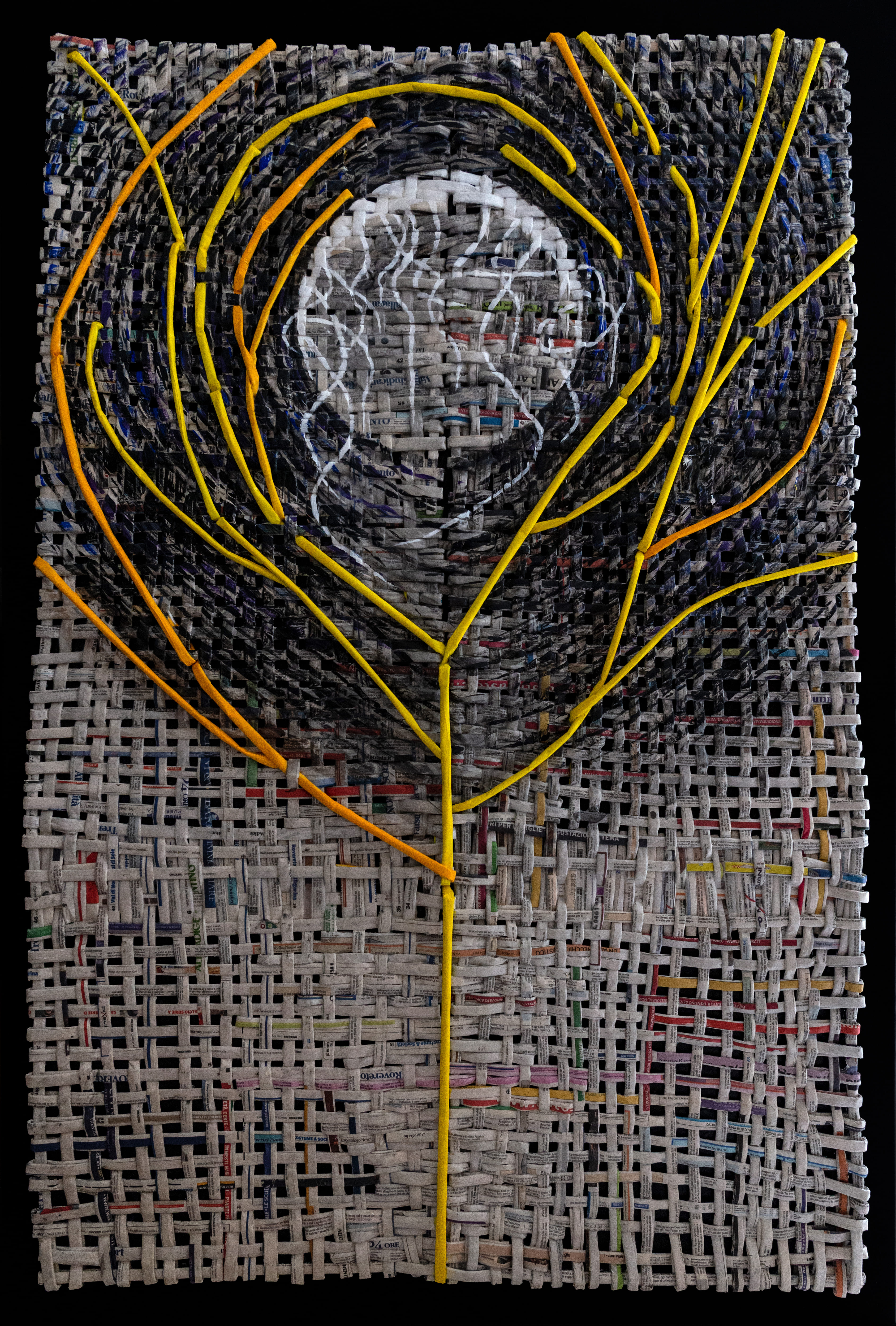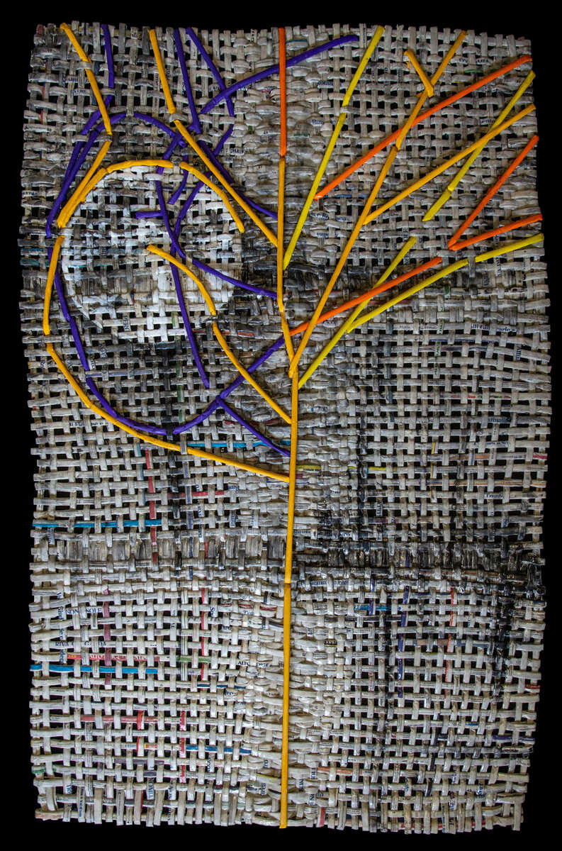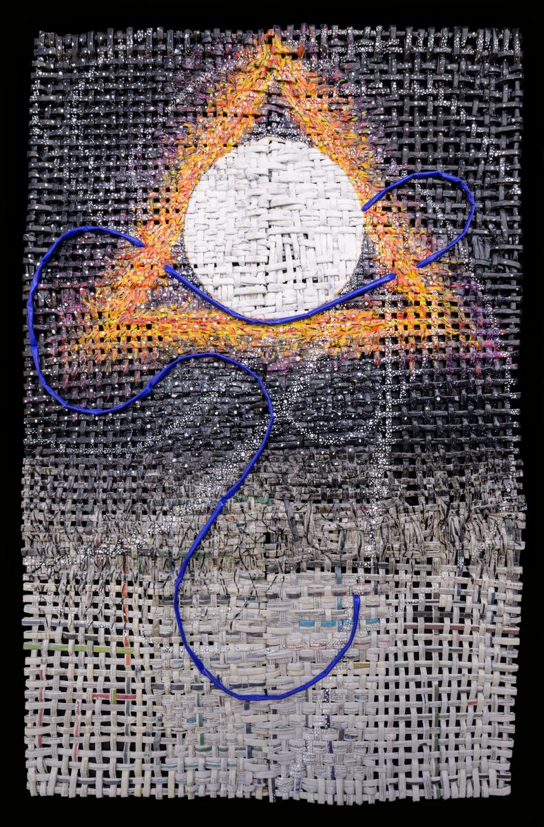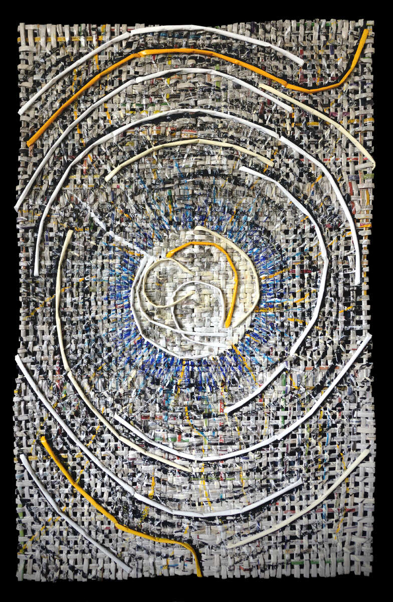 ”La Via Blu” è un’opera realizzata intrecciando rotolini di giornale quotidiano, creando una trama applicata poi su tela pittorica.