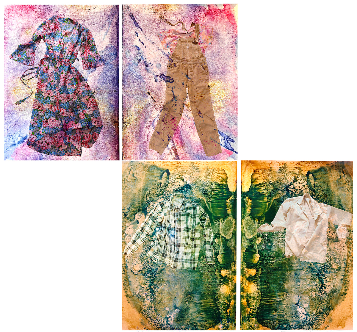 watercolours and vinavil on fabriano papers, clothes,, digital or print on film
