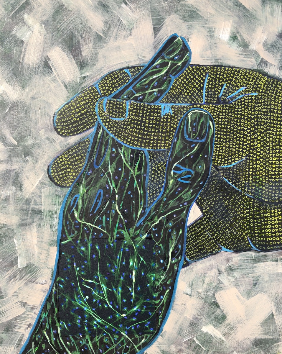 L’assemblamento prevalentemente verde dei neuroni viene elaborato dall’artista ricontestualizzandolo in un ambiente tecnologico, un rimando all’intelligenza artificiale. L’immagine simboleggia l’unione tra la biologia, la mano formata dalle unità cellulari e la tecnologia espressa dalla mano con il codice binario, nel dipinto su tela in giallo, due aspetti che possono coesistere reciprocamente a beneficio dell’uomo.