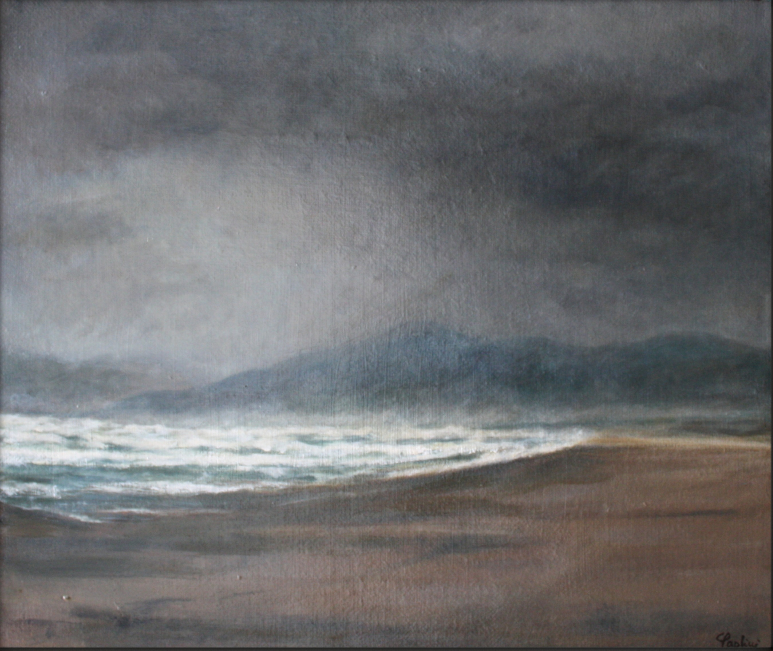 Un panorama che sfugge, un istante fermato da una foto durante un viaggio in auto nella mia Maremma, un temporale, acqua ovunque. Tutto scorre, e quell’albero, che un secondo dopo non c’era più, nel dipinto è fissato per sempre.
