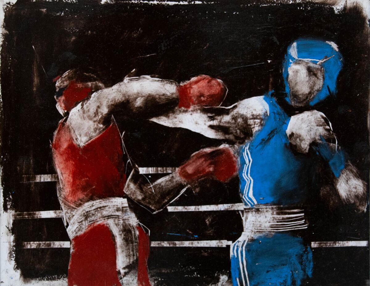 ”Studio di pugile in difesa” fa parte di una serie di piccoli dipinti dedicati allo sport, in modo particolare a quello del pugilato. L’interesse nasce per il movimento e il ”gesto” specifico dell’atleta in ogni disciplina, per il crearsi di forme e geometrie, di tensioni e dinamismi.