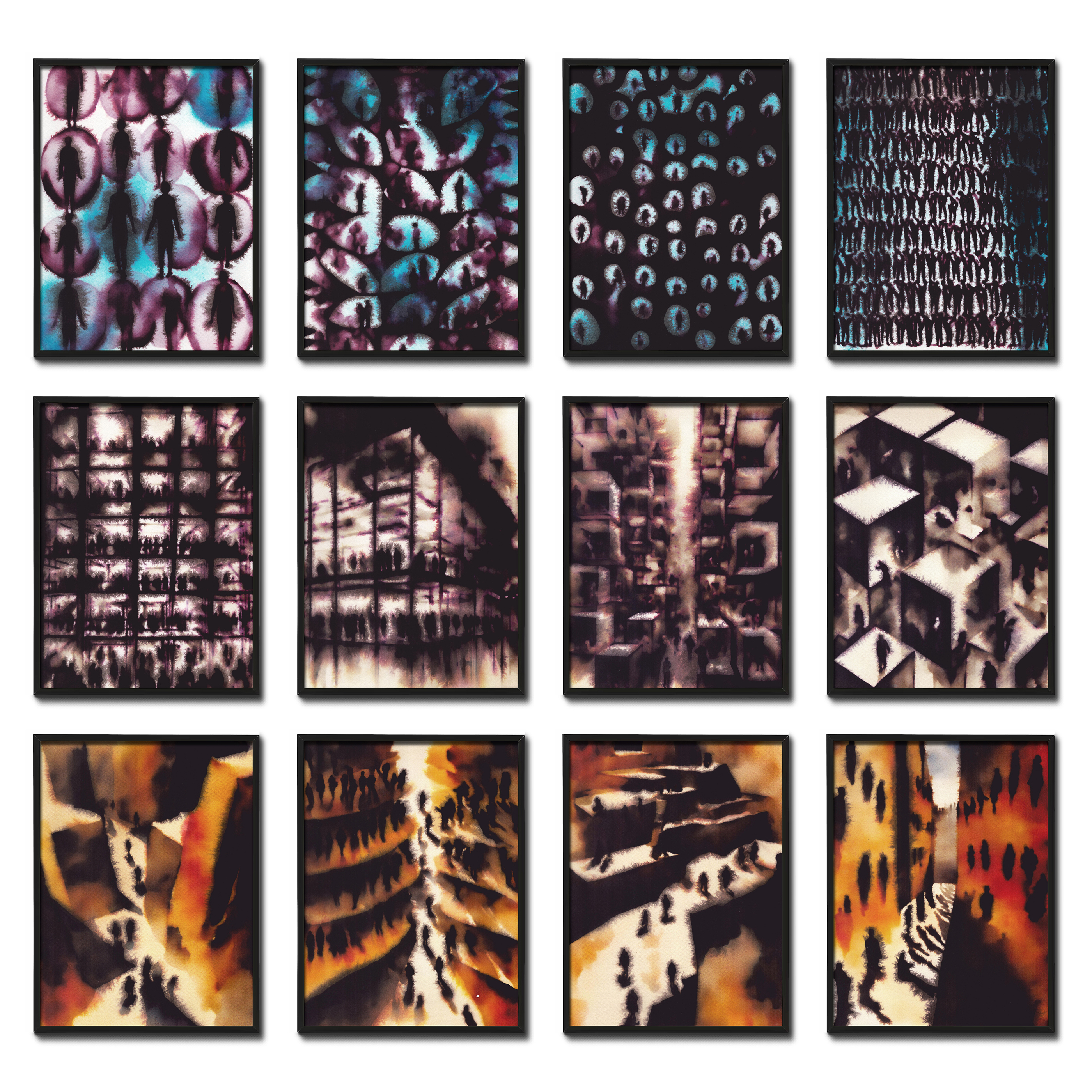 L’installazione comprende 12 acquerelli appartenenti a tre gruppi, da leggere orizzontalmente.