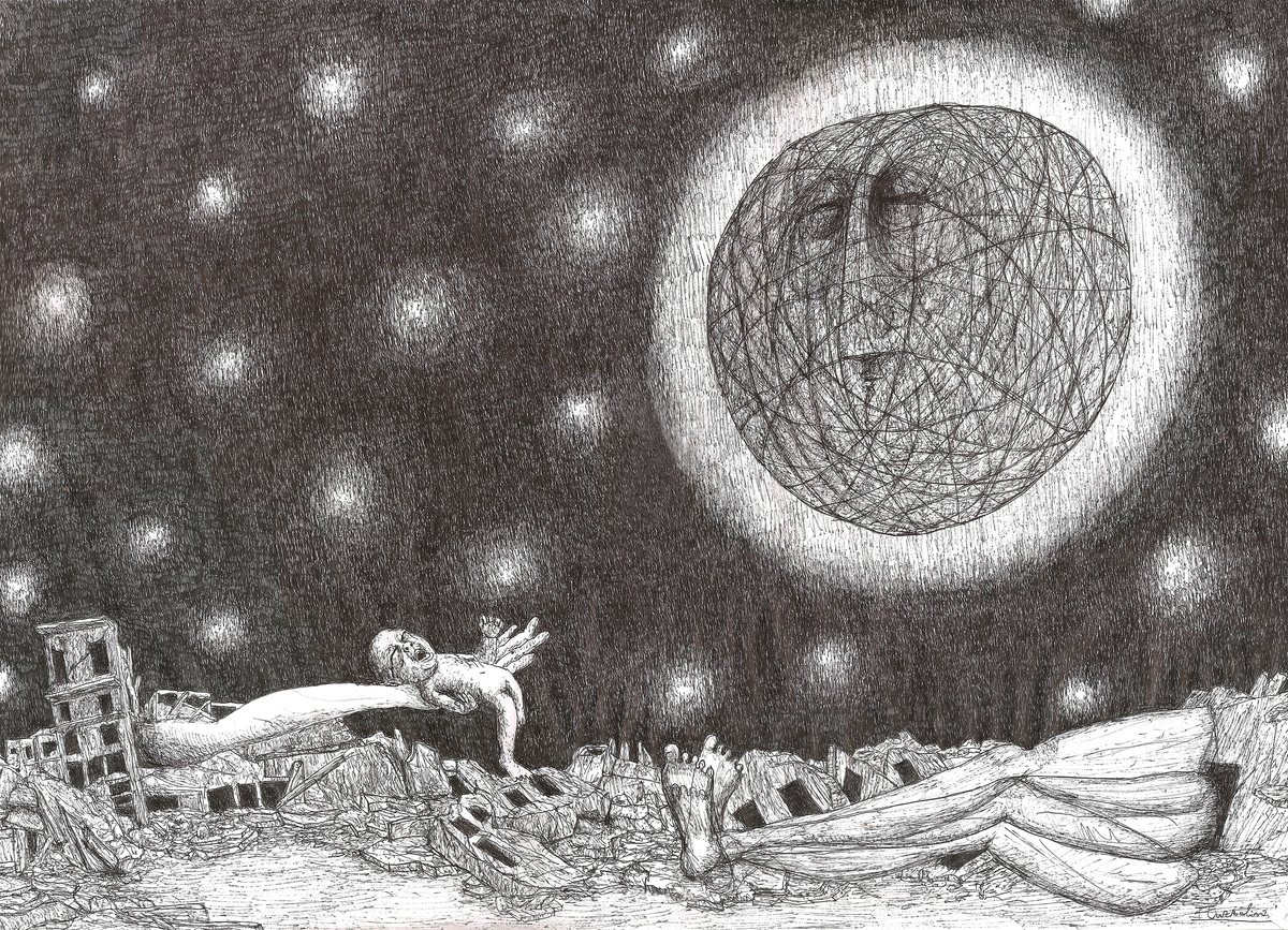 Il disegno rappresenta un neonato mutilato e sorretto da un braccio dalle dimensioni fuori scala tra le macerie della guerra nella notte. Di fronte, un arto inferiore si muove.