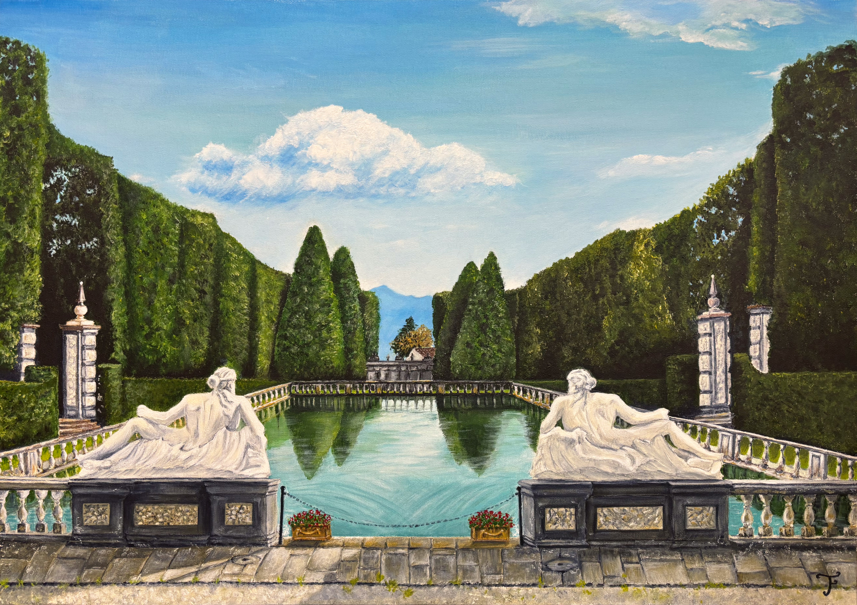 La Villa Reale di Marlia comune di Capannori (LU) nel 1806 venne acquistata da Elisa Bonaparte Baciocchi, sorella di Napoleone e principessa di Lucca che la trasformo’ e miglioro’ con interventi riguardanti la struttura ed i giardini come li vediamo ancora oggi, Il modello che adotto’ per la ristrutturazione della residenza e’ quello della Malmaison, residenza privata di Napoleone e Josephine vicino Parigi. Nello specifico nel dipinto viene riprodotta l’antica peschiera con i giganti in marmo raffiguranti i due fiumi toscani Arno e Serchio.