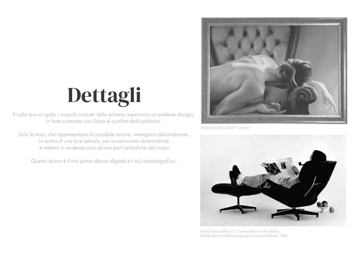 Ogni mio lavoro nasce da una fase progettuale che include la realizzazione di set e scatti, studiati interamente da me, con un’attenzione particolare alle luci e alla postura del corpo.
