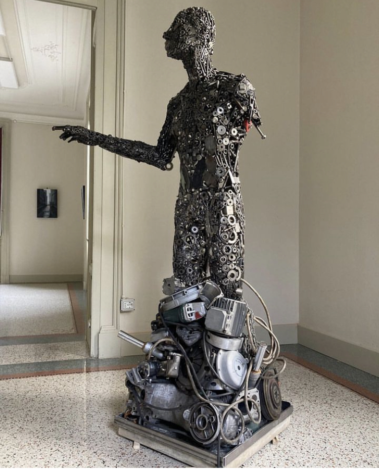 Questa scultura è una rappresentazione di una società disfunzionale dove l essere umano viene visto come ingranaggio necessario al sistema produzione/consumo.