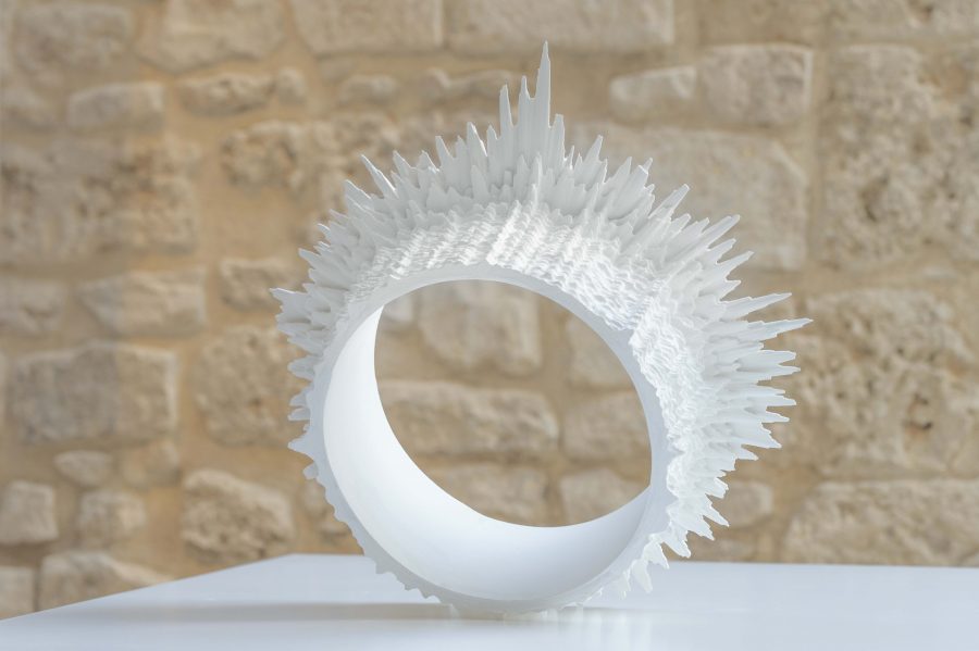 Cicàdidi (dal latino cicāda, cicala-famiglia d’Insetti Emitteri ), è il titolo di un ciclo di opere in cite specific nate intorno alla riflessione sulla circolarità del tempo e sui ritmi circadiani, di cui fanno parte disegni, ologrammi, light box e stampe 3D. Una ricerca in fieri, attraverso la quale affronto la tensione tra natura e artificio, la relazione tra memoria acustica e immaginario, analizzando il paesaggio sonoro del frinire delle cicale, a partire dal ricordo. “Cantano come se non ci fosse un domani, cantano per amore”. Questo è il principio e la genesi dell’opera, volta a indagare il delicato equilibrio: la precarietà tra uomo e natura, l’enigma dell’esistenza guardando il microscopico mondo degli insetti. Impalpabile come il canto delle cicale, ma in grado di spingere il corpo ai limiti, ponendo al centro di tutto l’amore fino alla morte. L’onda sonora è l’impulso creativo esercitato dalla passione, il motore della vita e dell’arte. Il frinire è prodotto direttamente dalle ossa, per stridulazione delle cartilagini, ed è inteso nell’opera, come il mezzo di trasmissione dell’energia vitale: è il richiamo amoroso che ritma e scandisce il vivere quotidiano di questi insetti. Realizzate mediante la combinazione di più processi di elaborazione digitale e sonora: dalla registrazione e campionatura del cicalio, avvenuta dall’alba al crepuscolo, all’elaborazione grafica vettoriale per la stampa retro illuminata, ed infine all’estrusione del suono in volume, con la stampa 3D. Oltre tremila metri di ologramma in strisce sospese al soffitto, catturano la luce e la scompongono nei colori dello spettro a diverse frequenze, riproducendo la stessa capacità del tessuto alare dell’insetto, di trattenere la luce visibile. La forma viene riconsiderata attraverso le sue emanazioni sottili, all’intensità radiante dell’energia grazie alla spazialità della luce e al riverbero del suono, insieme a un sistema audio immersivo studiato appositamente per lo spazio. La lunghezza d’onda compresa fra 450 e 750 nanometri, forma diversi angoli di incidenza ed effetti multipli di riflesso e dispersione, rendendo lo spazio architettonico un ambiente mutevole e in grado di attraversare gli stati della materia. Come in un coro di voci, il suono, ritmato dalla luce, è anche memoria di un paesaggio che cambia, traccia lo spazio liminale in cui il rito e il mito ritornano ad una realtà che deve riflettere sul valore del tempo e sulle conseguenze dei cambiamenti climatici per l’ambiente.