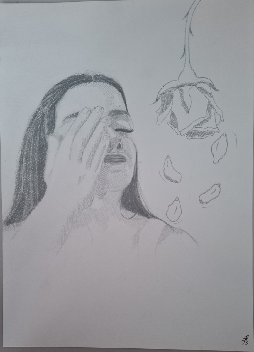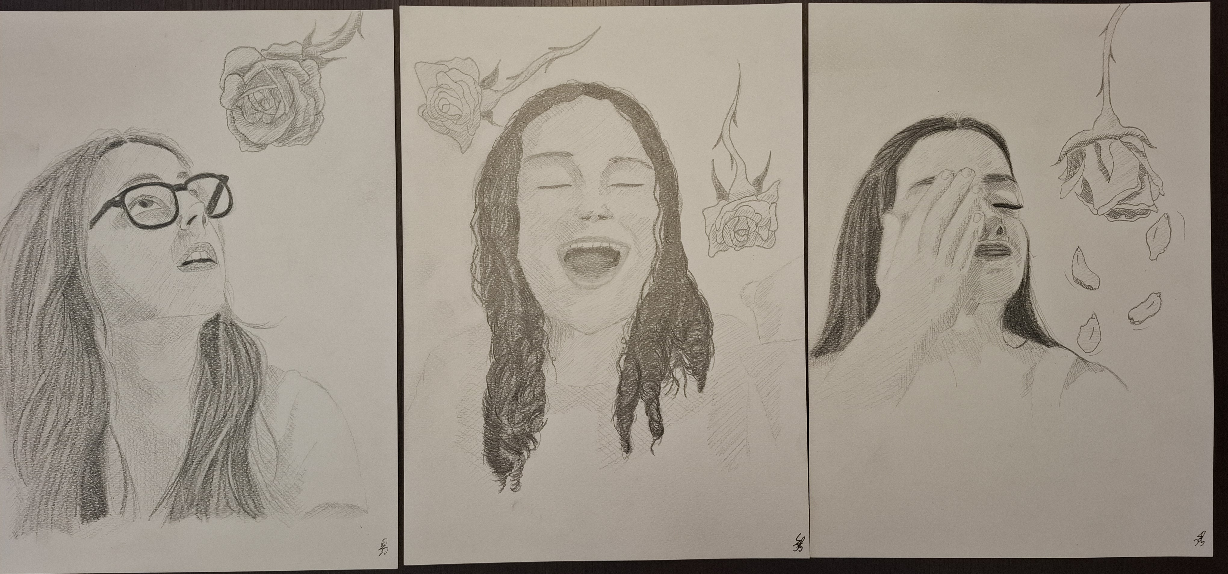 L’obiettivo di questa serie di disegni è raccontare la storia dell’amore e il modo in cui gli esseri umani entrano in contatto e vivono con esso. Da sinistra verso destra abbiamo: una ragazza che entra in contatto con l’amore per la prima volta ,sorpresa e incuriosita. Nel disegno centrale una ragazza che ha imparato a convivere con l’amore ed è felice poiché la sua vita è molto più piena adesso. Infine a destra, è presente una ragazza che piange a causa della fine del suo amore, rappresentato dall’appassimento della rosa.