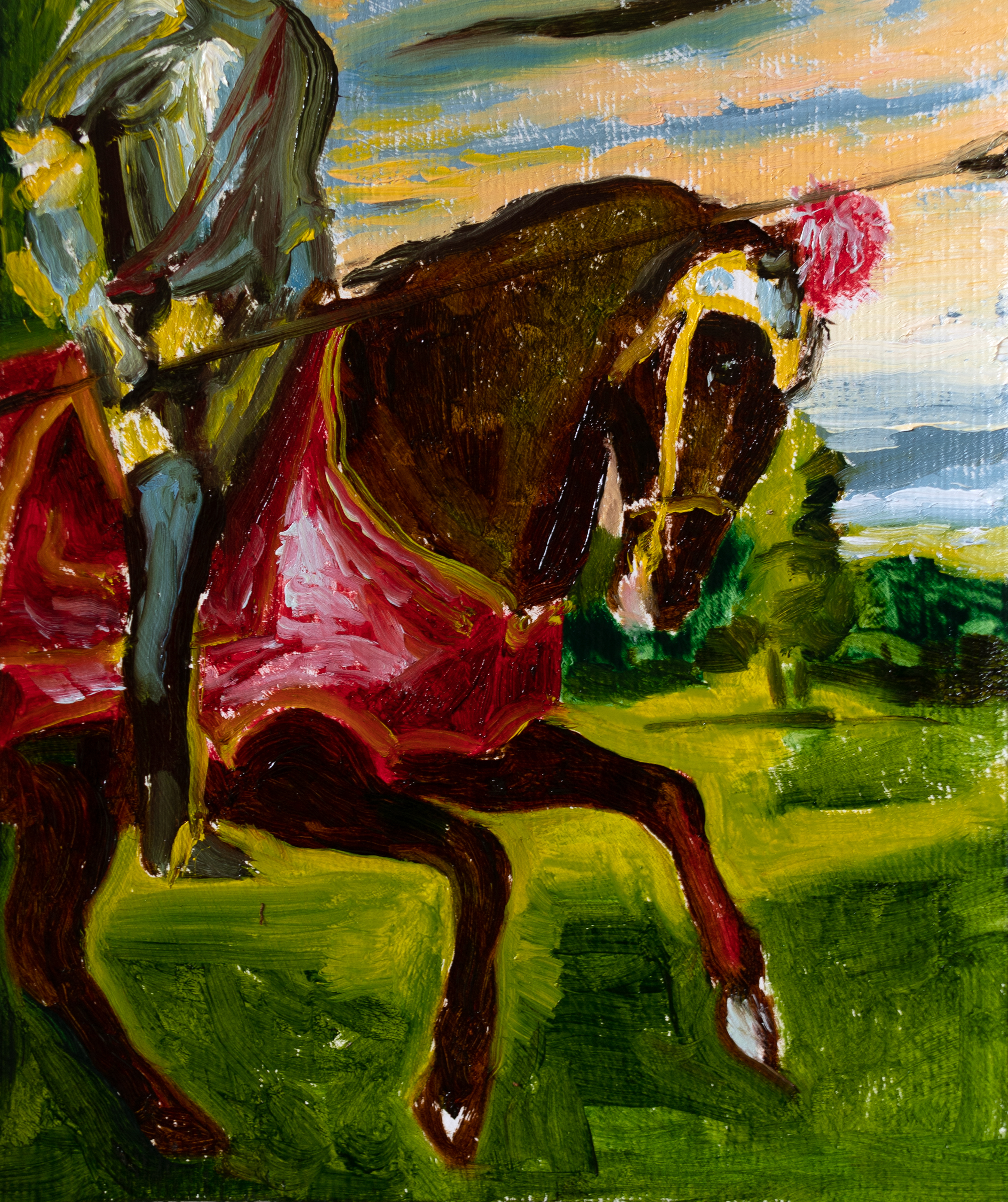 In particolare ”Meu cavalo só falava inglês” tratta dell’impressione che ho avuto del leggero e blando intervento della polizia che ha molto lasciato fare, con pochi poliziotti a cavallo in breve disarcionati. Un’impressione di ridicolo e impotenza che in pittura si è chiarificata nel momento in cui ho dovuto rappresentare la figura dell’uomo a cavallo: gli esempi di ritrattistica del potere (Carlo V di Tiziano) e del cavaliere virtuoso (San Giorgio e il drago di Raffaello) sono emersi come diretti significati a cui la storia dell’arte ci ha educati.