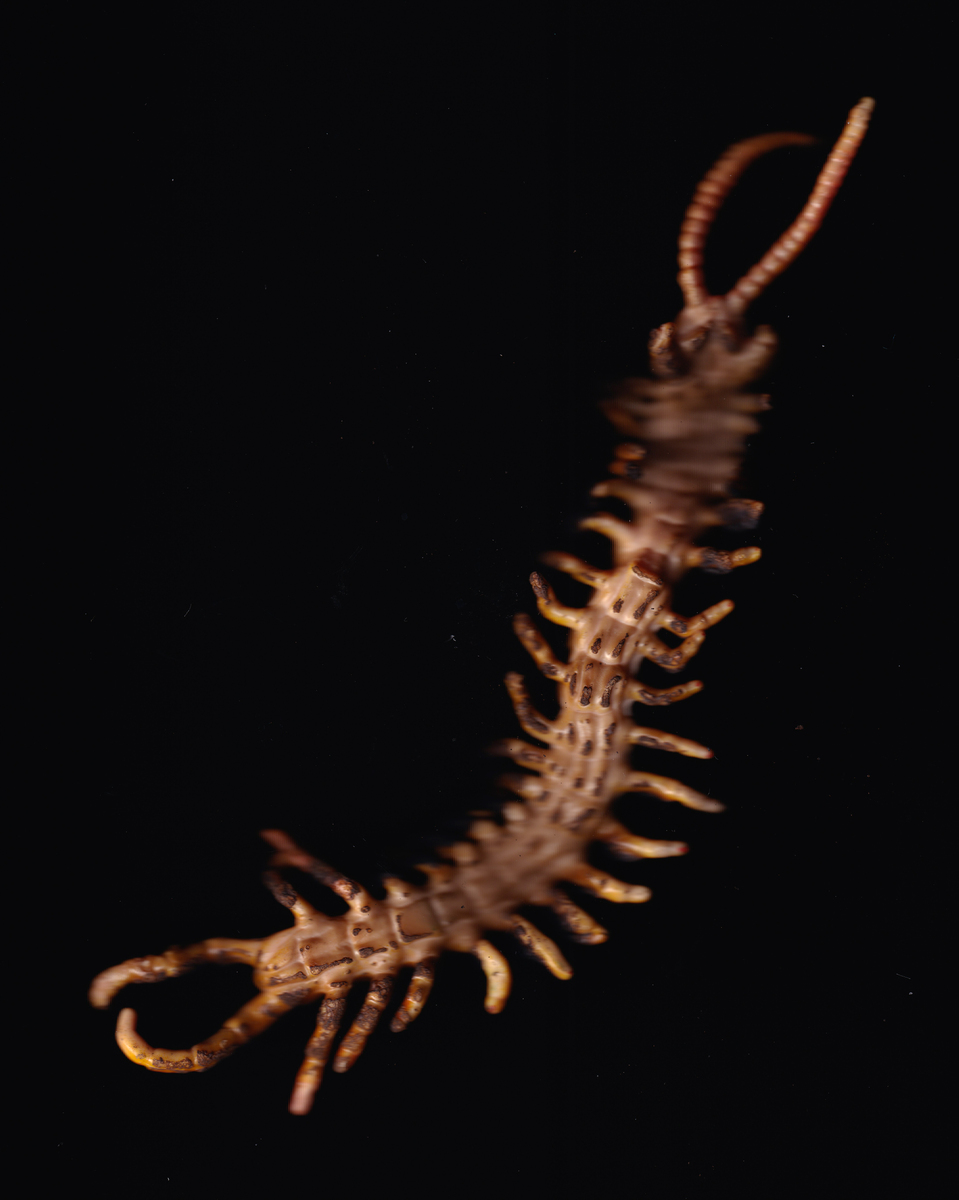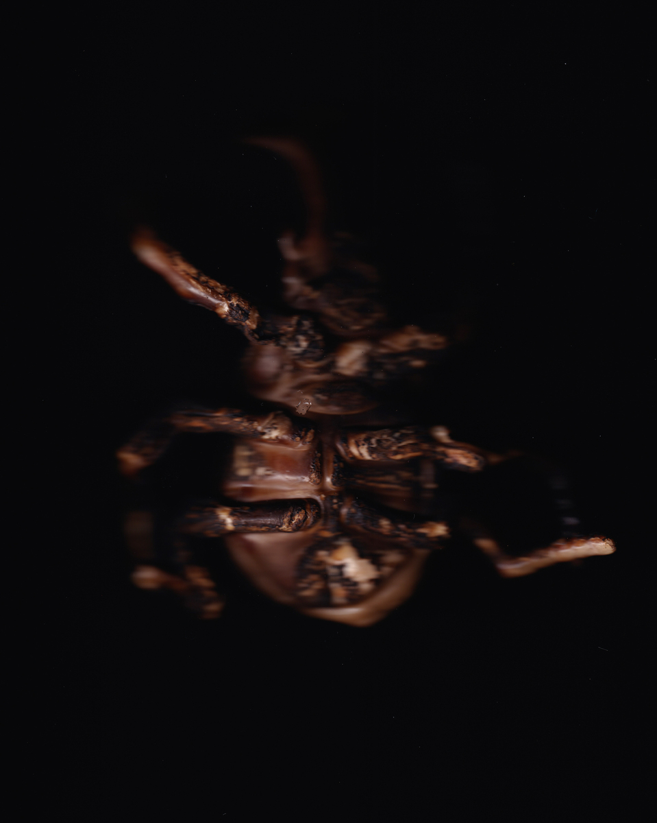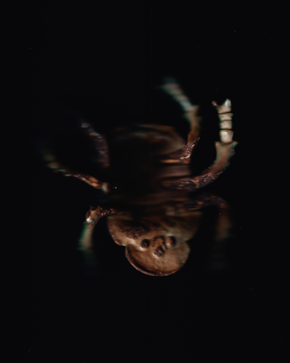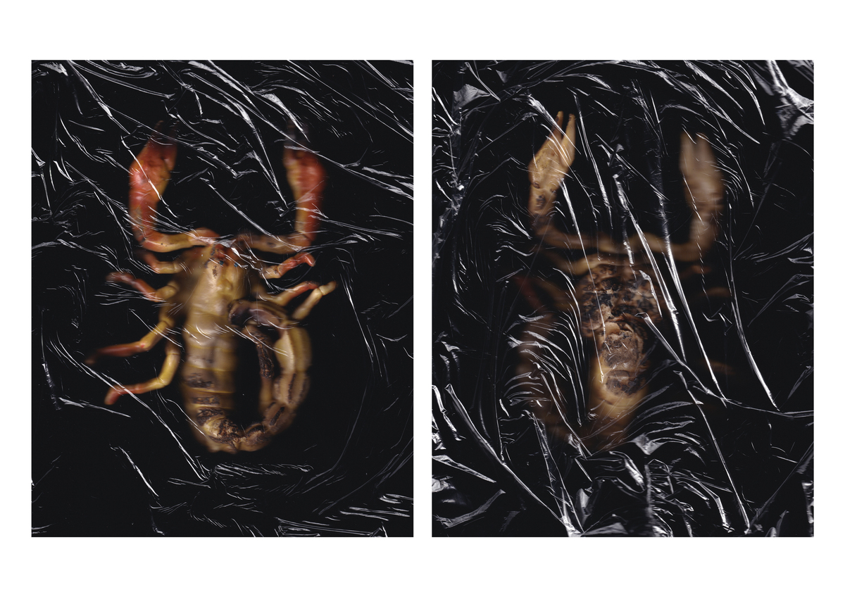 Un’immagine ingrandita di uno scorpione, presentata tramite una scansione digitale fronte-retro. L’esoscheletro emerge dall’oscurità, riflettendo strategie di mimetismo e adattamento, come metafora di un’esistenza complessa, multiforme e sensuale. Un esame più attento rivela che si tratta di un insetto finto, di plastica bruciata.