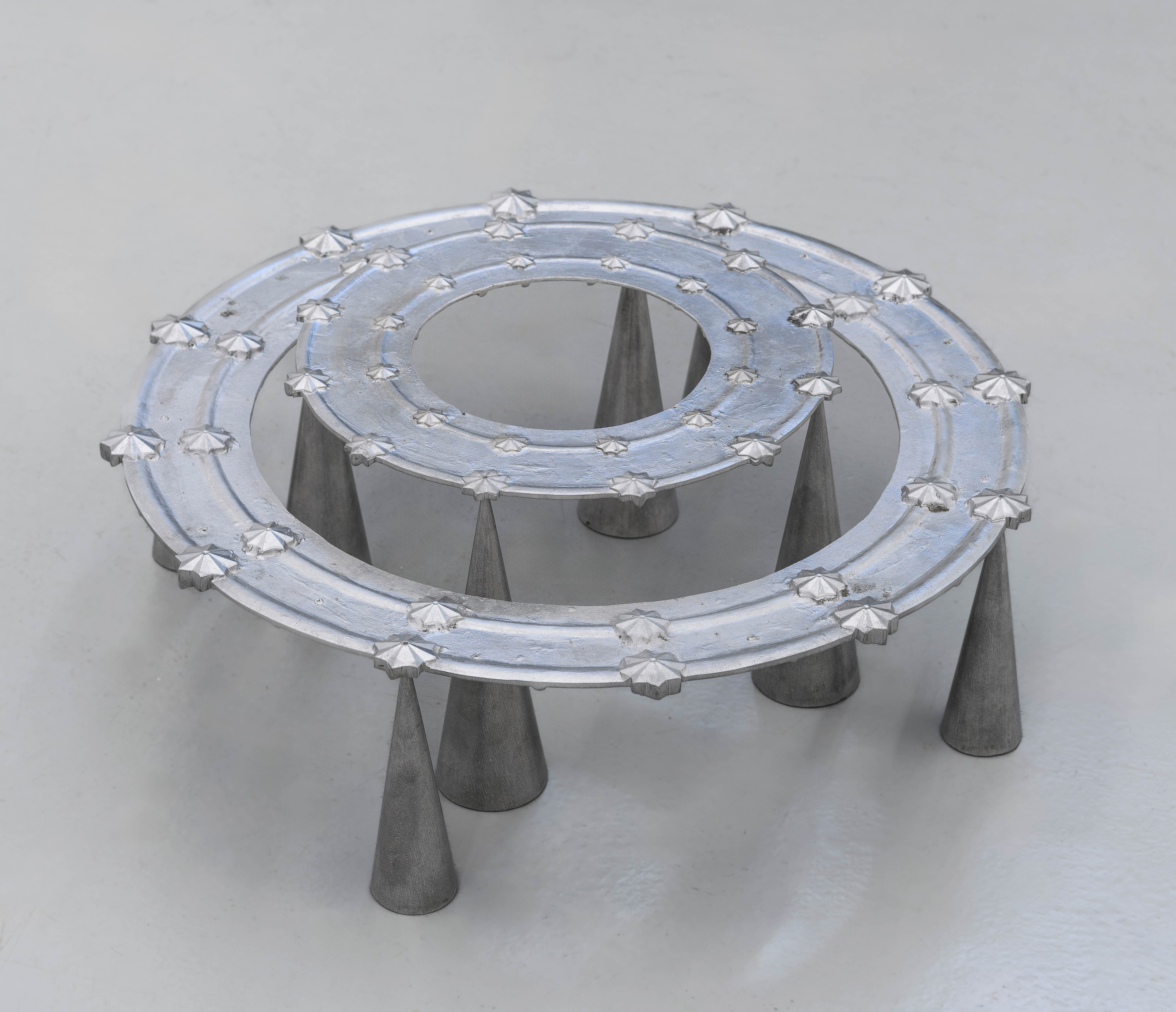 Piccolo cielo nasce come un ribaltamento rispetto allo stellario – generalmente utilizzato per cingere il capo delle statue che raffigurano la Vergine Maria – che in questo caso giace a pochi centimetri da terra, sorretto in equilibrio da affusolati coni metallici. Per l’artista, l’osservazione delle stelle non avviene scrutando verso l’alto; stavolta lo sguardo attraverso l’opera è spinto ancora più radicalmente in basso, come se l’elevazione, metaforicamente intesa, fosse una questione di passi da compiere.