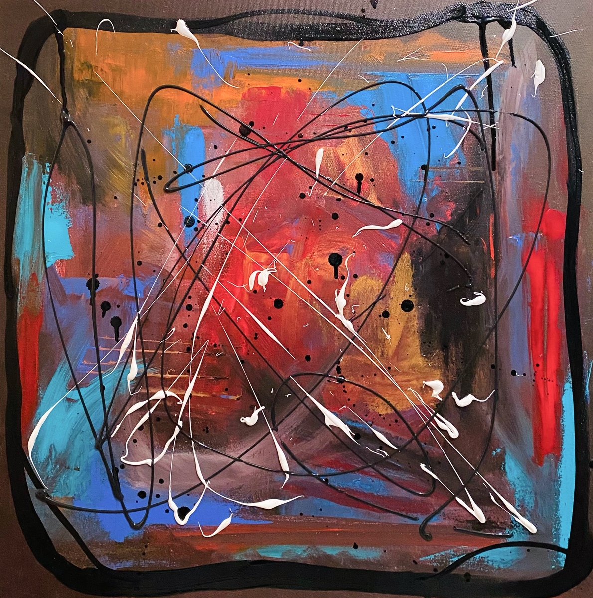 ”Ogni cosa, prima o poi, arriva sempre alla fine; fine a cui dopo segue un nuovo inizio. Ed un nuovo inizio è sempre possibile. Dopo due anni di stop nella creazione artistica per problemi personali, questo lavoro è nato dalla voglia di ricominciare a tirare fuori ciò che ho dentro. I colori determinano i vari stati d’animo che attraverso costantemente, le linee sono i confini che cercano (a volte invano) di contenerli, il dripping caotico è un passaggio necessario a provare quella sensazione a metà tra paura, sulla possibilità di rovinare tutto, ed euforia, sull’ascoltare fermamente ciò che il mio io interiore richiede di fare in quel momento. Da un momento buio, i colori si ergono verso l’alto a cercare la luce di un nuovo inizio”.