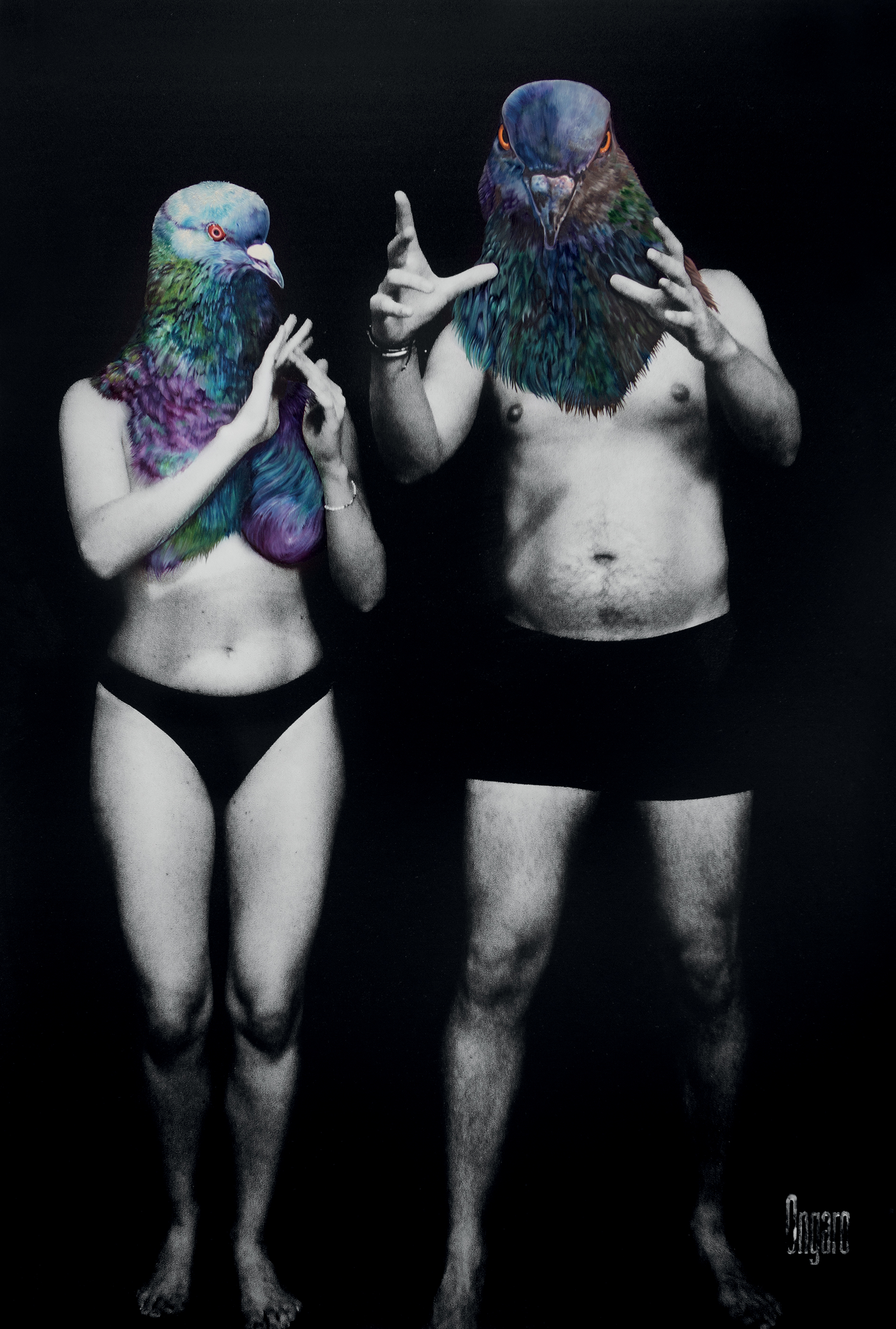La mia ricerca trova ora la sua giusta dimensione nell’incontro tra macchina fotografica e tavolozza, tra corpi umani e teste animali.