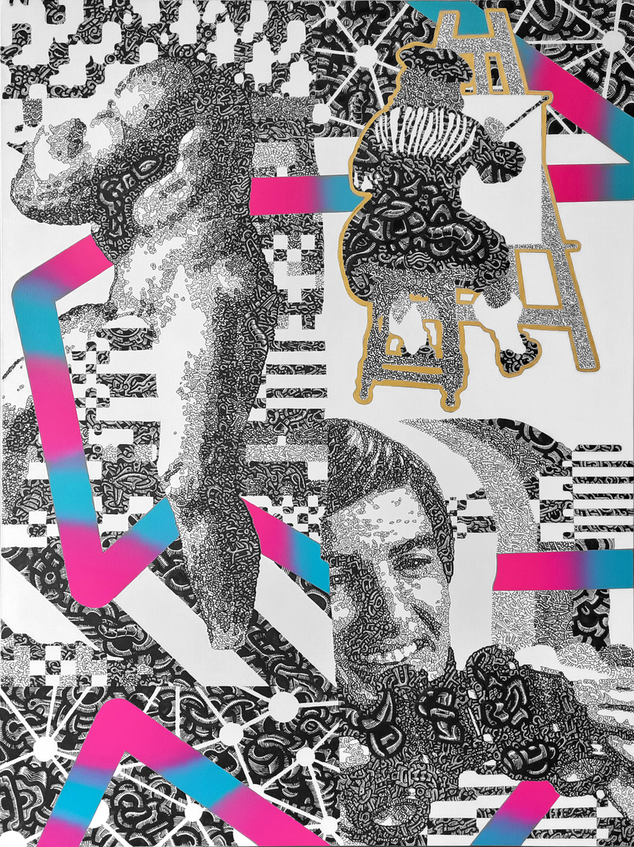 Il quadro mette in scena un’ironica allegoria dell’atto creativo, facendo un parallelismo con il meccanismo di generazione delle immagini ad opera delle intelligenze artificiali.