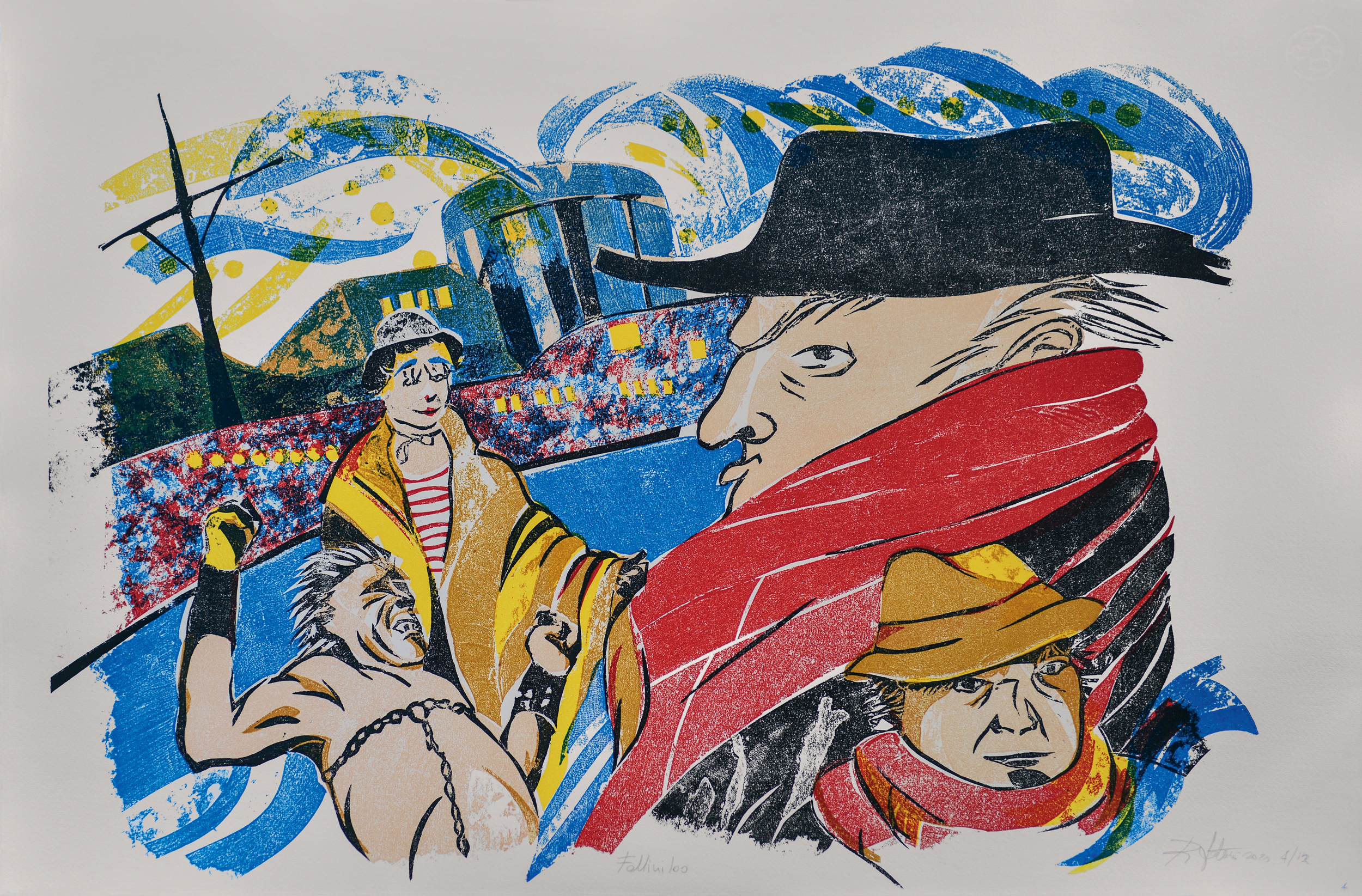 Rivisitazione del celebre profilo di Fellini con, sullo sfondo, due tra le scene più iconiche della sua produzione cinematografica: Gelsomina con Zampanò che spezza le catene (la Strada) e il passaggio del Rex (Amarcord). Un omaggio dell’artista a due film Premio Oscar.