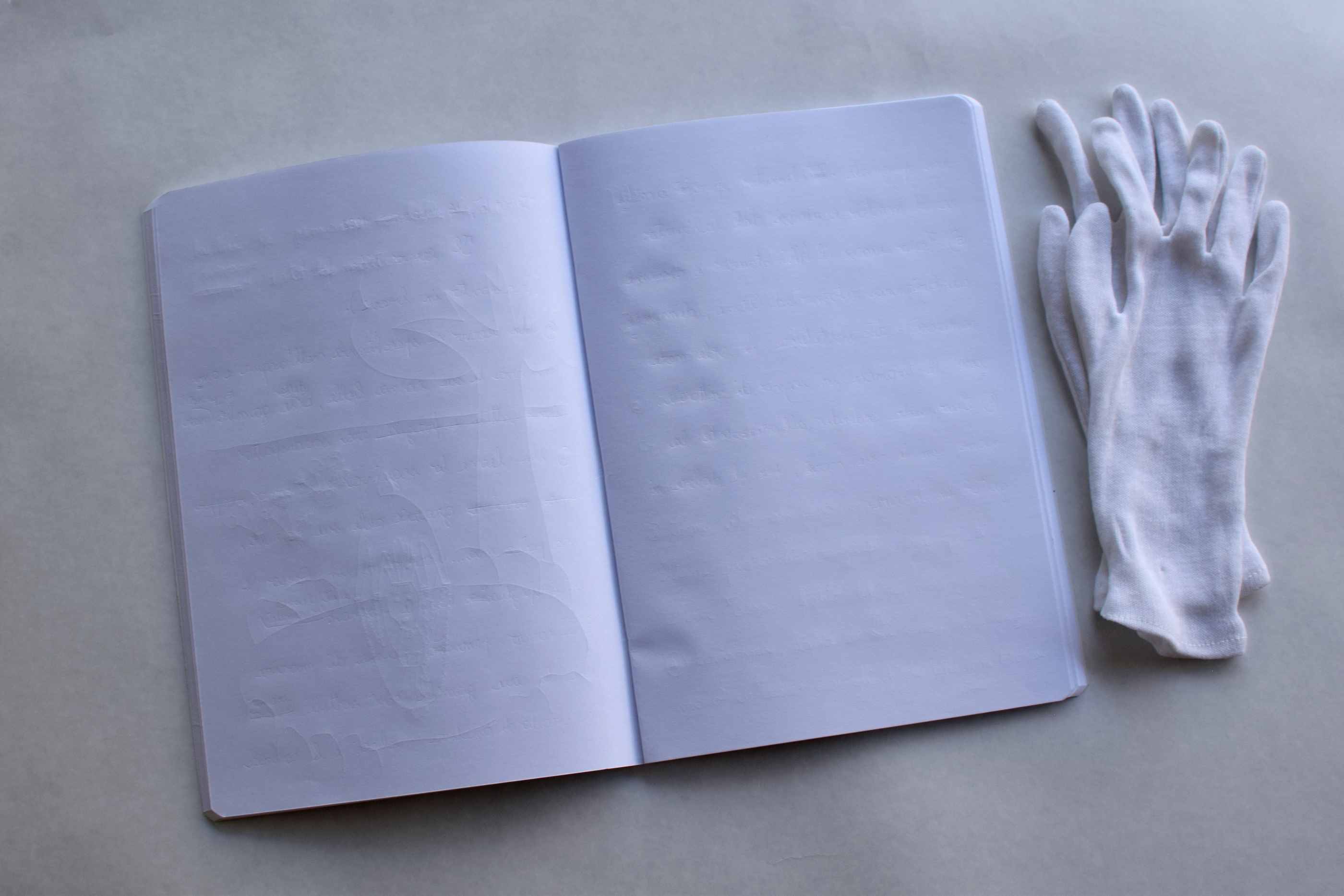 Con l’intento di dar risalto alla traccia prodotta da uno strumento scrittorio su un foglio, ho deciso di realizzare dei quaderni di carta totalmente bianchi in cui è visibile il segno lasciato da una penna senza inchiostro.