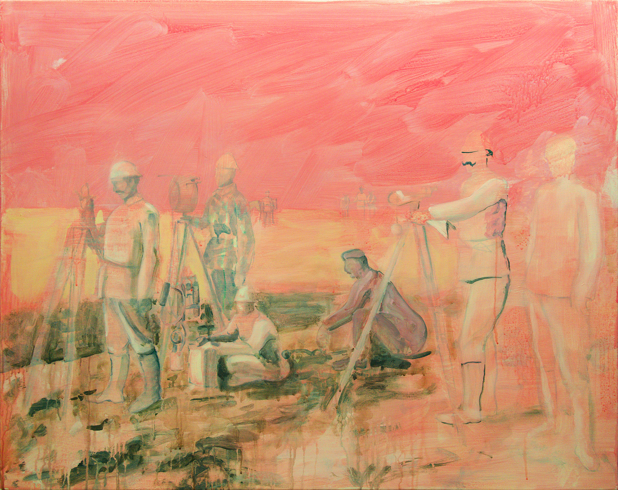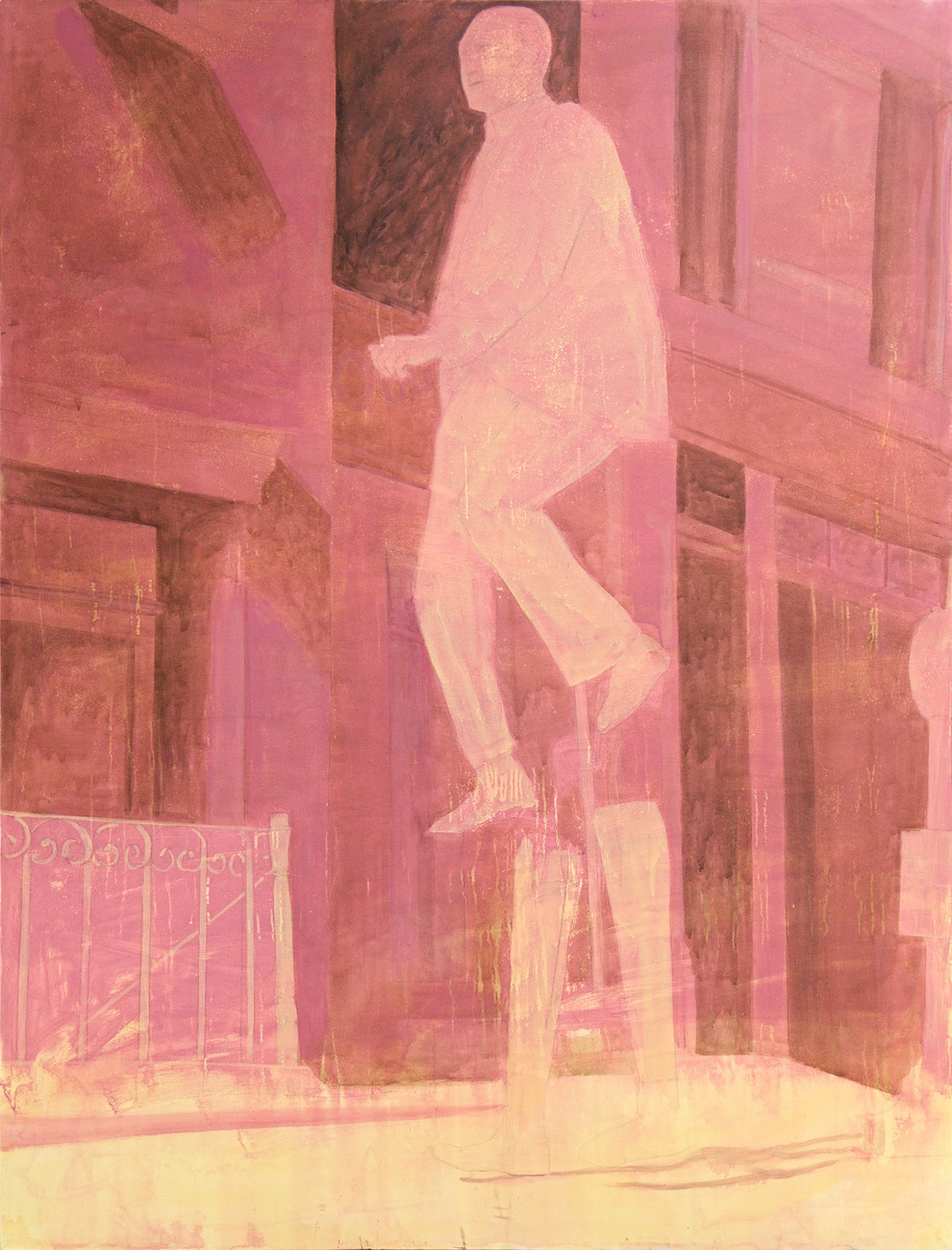 Nel mio recente lavoro utilizzo immagini storiche che hanno a tema le invenzioni. Alcune hanno avuto un reale utilità e impatto sociale, altre invece sono generate da sentimenti goliardici. Quello che cattura la mia curiosità sono questi momenti di pionierismo scartati o dimenticati dalla storia e che rivelano possibilità mai percorse, a volte fino a risultare il set di un film fantascientifico. Nel dipinto ”Altro giro altra corsa” l’immagine si snatura perdendo dettegli e acquisendo un atmosfera dal colore irreale. Da immagine goliardica di un uomo pronto ad andare in ufficio con la sua ventiquattrore diventa una visione distopica. Pennellate frenetiche, colature e contrasti cromatici muovono la superficie e in secondo piano del dipinto abbiamo un signora con la maschera antigas che spinge un passeggino altrettanto fornito contro l’inquinamento dell’aria.