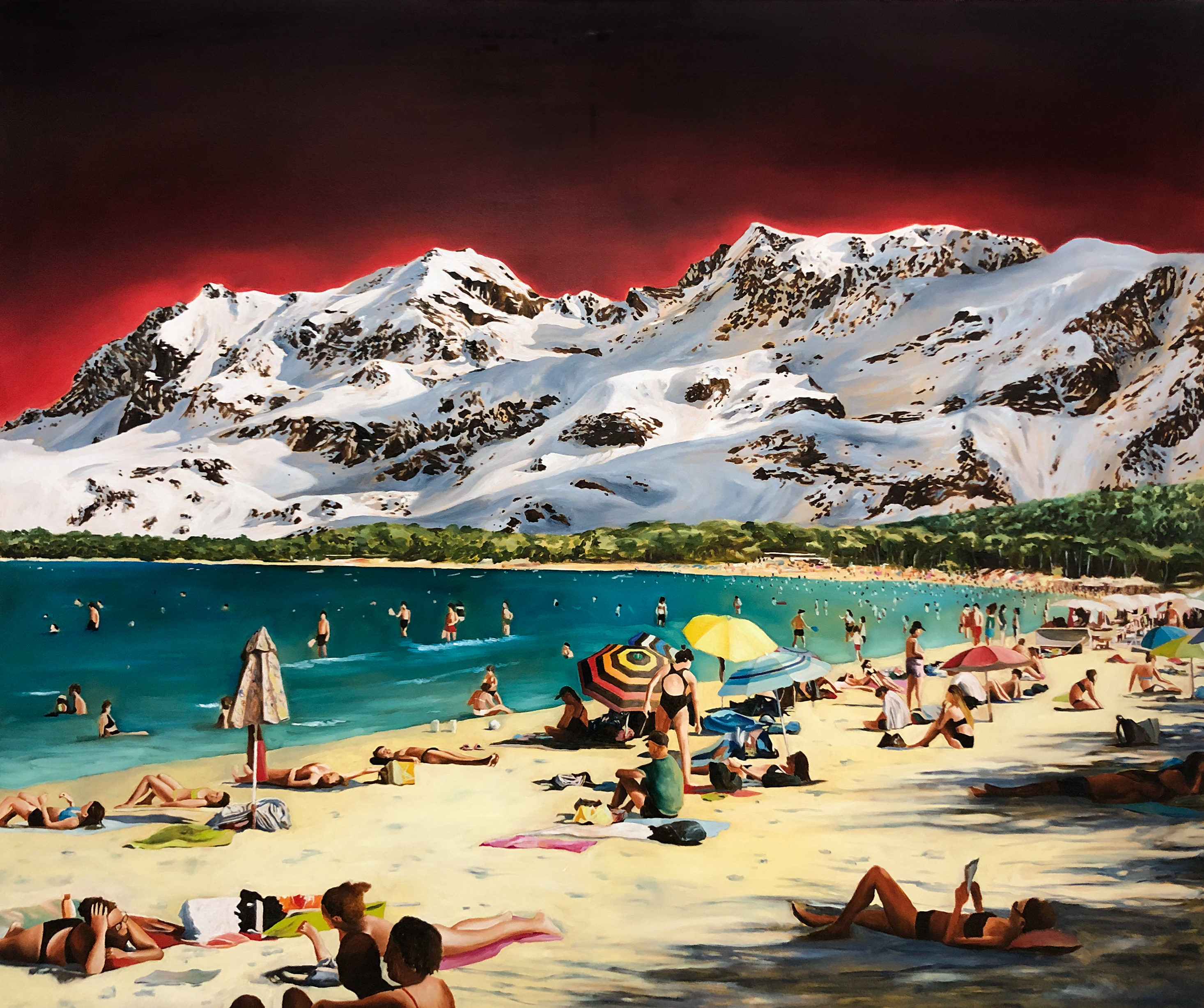 Una cartolina dalla villeggiatura, come si usava un tempo: la spiaggia è affollata di bagnanti, il sole accecante si riflette sulla baia dalle acque fresche e cristalline. Ma dietro la pineta costiera non figura l’entroterra estivo: picchi innevati si stagliano su un cielo dai bagliori rossastri. L’umanità si è sentita padrona del mondo, cercando di piegare la natura ed il clima al proprio volere, volendo godere di tutto nel medesimo istante, senza disagi, senza fatica, comodamente seduta sulla propria sedia a sdraio. Le stagioni sfumano l’una nell’altra perdendo i propri contorni, i confini tra ciò che è lecito pretendere dalla Natura e ciò che non lo è sono sempre più incerti - e chissà se le generazioni future potranno ancora inviarla, quella cartolina. La spiaggia è ispirata alla baia di Calvi (Corsica) e le montagne alle cime antistanti il colle della Bettaforca (Ao), entrambi luoghi visitati dall’artista in momenti di grande affollamento nello scorso 2023.