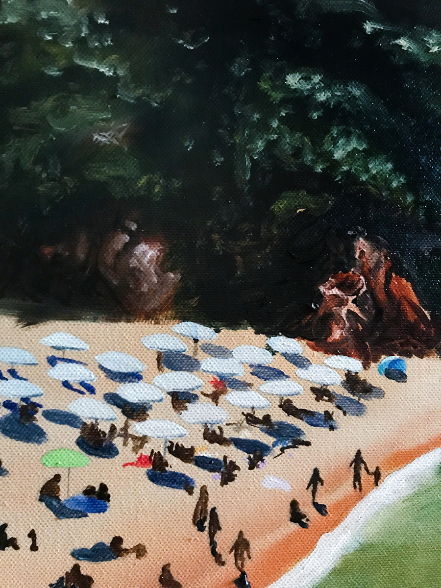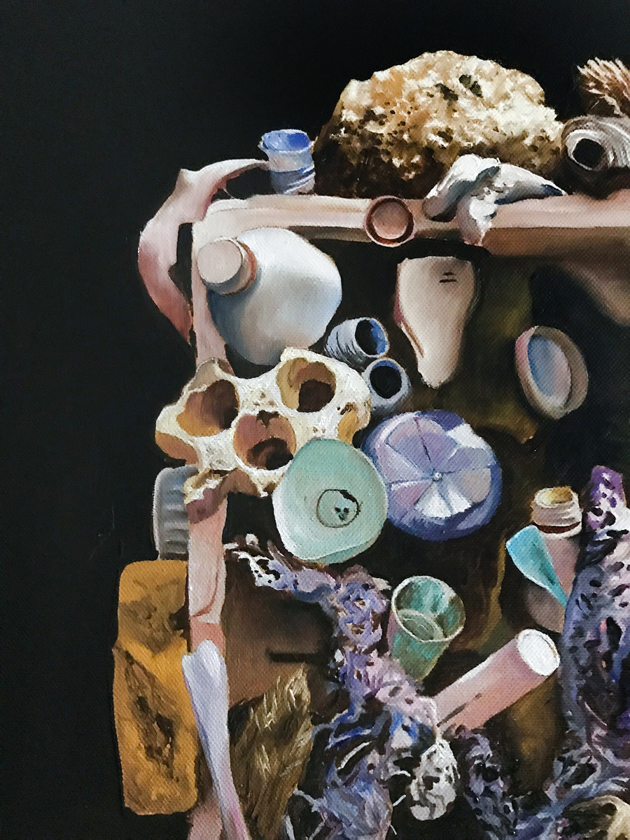 Li Cossi è il nome di una suggestiva spiaggia incastonata tra il verde della macchia mediterranea e le rocce rosse della Gallura nel nord della Sardegna, un luogo che ho visitato durante un viaggio nell’estate del 2020. Nell’opera è trasfigurata, circondata dal buio e sovrastata da un imponente simulacro plastico di barriera corallina. Questo lavoro riunisce l’esperienza di Marine Litter Art che feci nel 2021 con l’associazione per la tutela ambientale Marevivo Sicilia ai ricordi di quel viaggio che per me hanno ormai assunto una connotazione dolceamara, alterati da tutto quello che è venuto dopo e divenuti anch’essi quasi un simulacro di ciò in cui credevo un tempo. L’opera parte quindi dallo spunto autobiografico, dal deterioramento di ricordi, speranze e sogni, per arrivare però ad abbracciare il tema dell’ecosistema marino, dello sfruttamento delle coste e dell’inquinamento ambientale che in estate col turismo di massa subisce spesso un’impennata drastica.