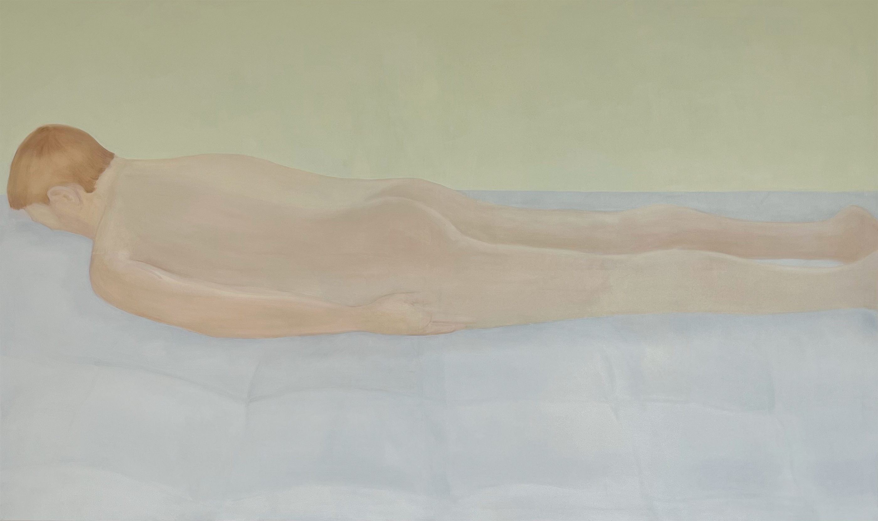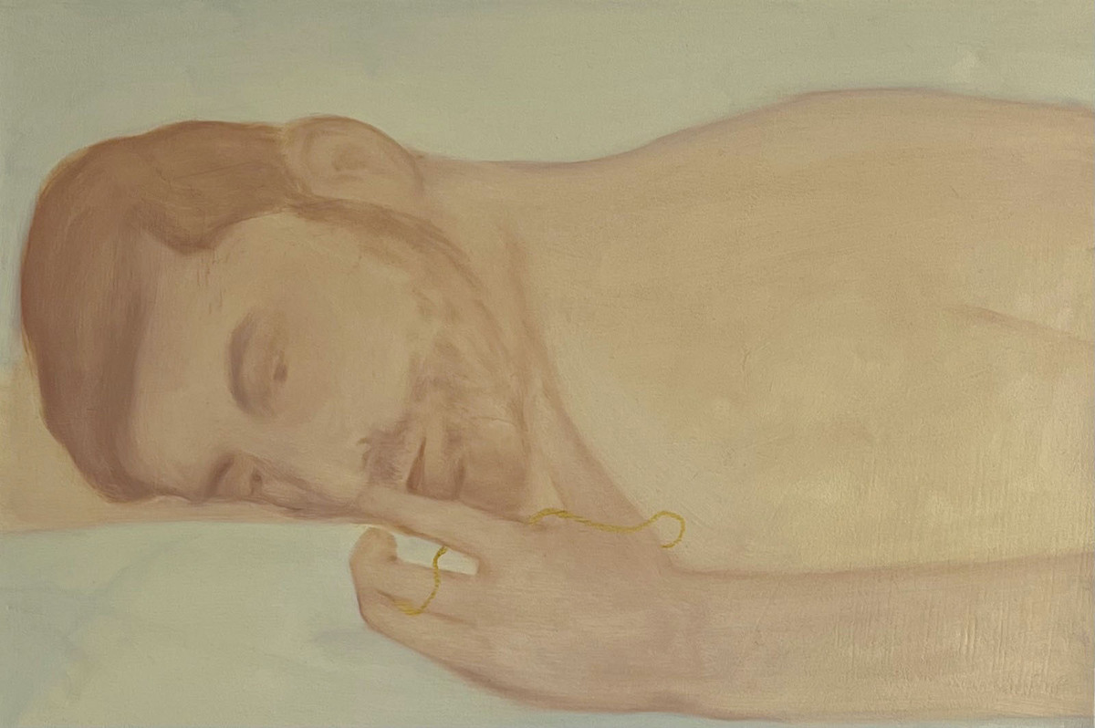 Il partner sprofonda in un soffice piumone completamente spogliato dai propri abiti immerso in un’atmosfera calma. Nella mia poetica recente emerge il tema dell’intimità quotidiana come se guardassi dallo spioncino della porta di casa, azioni o dettagli ravvicinati del marito si tramutano in celebrazioni dell’ordinarietà domestica.