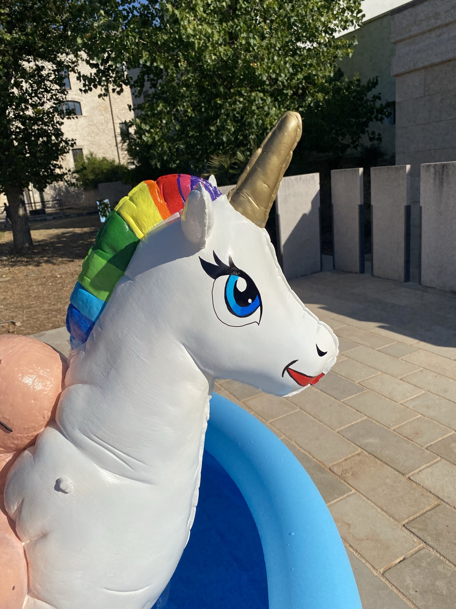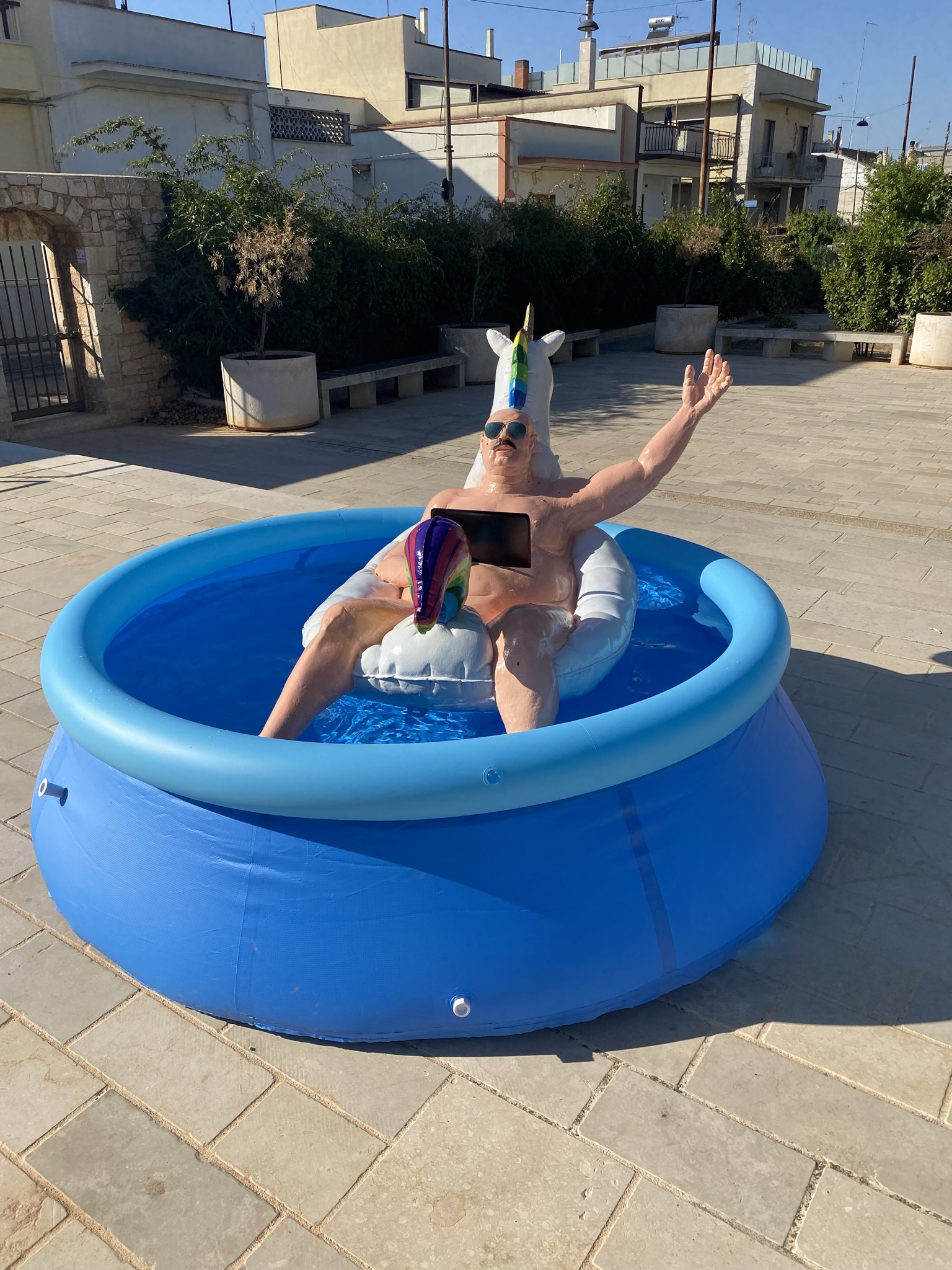 Il gesto del saluto, ambiguo e carico di significato, simboleggia la distanza emotiva e psicologica dell’uomo dalle tragedie che osserva. Questo gesto può essere interpretato come un segno di riconoscimento o di disinteresse, comunicando superficialità e una presenza solo formale. Il materassino a forma di unicorno aggiunge una dimensione ironica e paradossale all’opera. L’unicorno, simbolo di purezza e innocenza, è qui utilizzato in modo critico per rappresentare l’illusione di innocenza che l’uomo comune si attribuisce. Questo contrasto mette in evidenza l’incoerenza tra la percezione di sé come individuo innocente e la realtà della complicità passiva negli eventi del mondo.