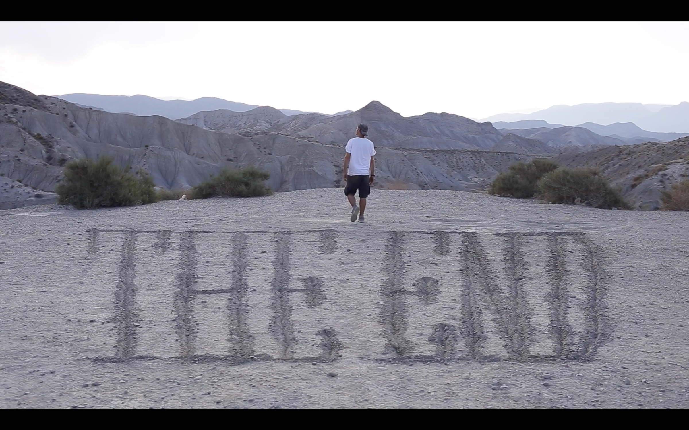 This still-shot video shows an in situ intervention in the Tabernas desert in southern Spain. For this ephemeral intervention, I wrote the phrase “The End” in anamorphosis and by digging furrows. The choice of this phrase, in this typeface and in this location, is at first sight a reference to the Western films for which this desert has been a recurrent setting. But my intention was not to stop at this obvious reference, but rather to create an image that would directly question the viewer, confronting him or her with an ambiguous situation in which several layers of interpretation are superimposed. First, there’s the choice of anamorphic drawing technique, as if to point out the limits of spatial representation and the “flatness” of the image. But there’s also the meaning of this phrase: the end, of course, but the end of what, really? Of a film? Of a world? Of our world? A phrase that inevitably resonates with the current state of ecological collapse, all the more so with this view of an arid, hostile desert. Also, made over the course of a day (from sunrise to sunset), this intervention says something about artistic work, physical labor where the body is put into play until it is exhausted. And then something else happens in this still-shot video. It’s not just a photograph. After approximately 1 minute, a figure enters the field and crosses the stage to the edge of the field. After a moment’s observation, he literally leaps into the void and disappears behind this end of the territory. This leap into the void may leave a burlesque impression, but it actually points to a certain absurdity in our relationship with the world.