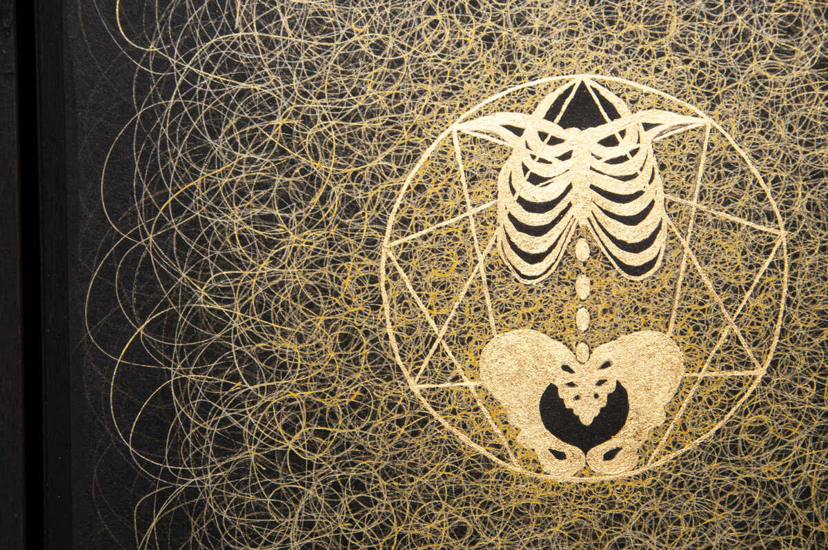 Il trittico presenta la scomposizione in parti simboliche dell’Enneagramma, mappa antichissima della conoscenza di sé, probabilmente nata nell’Antica Mesopotamia ed utilizzata all’inizio del 1900 dal filosofo e maestro di danze armeno G.I.Gurdjieff con una doppia valenza: come modello matematico del modo di procedere dei fenomeni e come modello della personalità umana. La parte minerale dell’essere umano è incastonata come una preziosa gemma all’interno della mappa, estroflettendosi e rilucendo nel flusso animico color oro che contrasta sul nero, profondo ed universale.