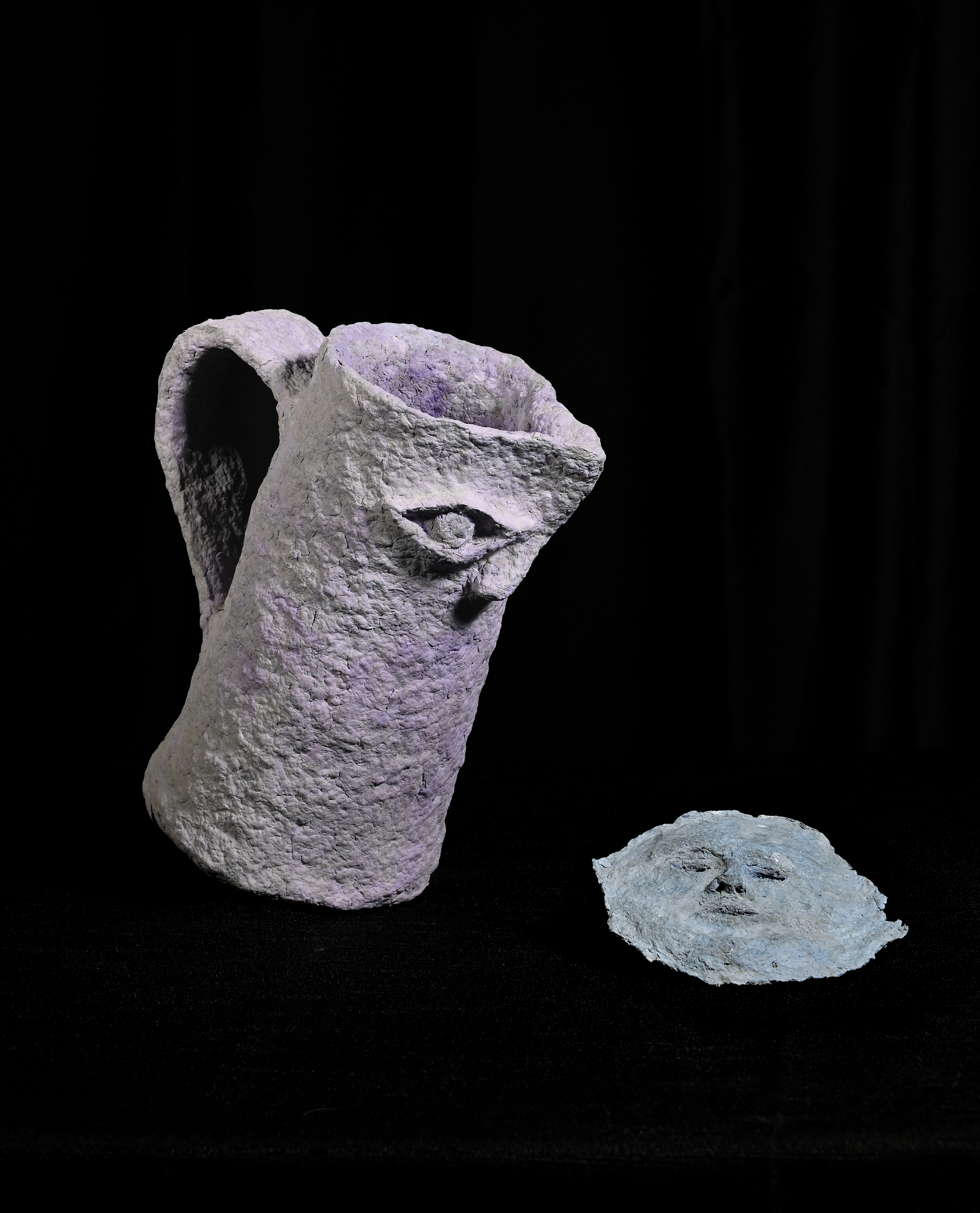 Valeria Carrieri, Brocca e volto / Autoritratto notturno, 26,5x17x25 e 14x12,5x2 cm, 2023, cartapesta dipinta