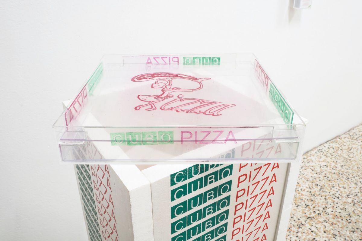 Scultura composta da diverse lastre in EPS, utilizzate come matrici e stampate su carta Hahnemühle da 300 g. Dopo la stampa, le matrici sono state incollate e assemblate, diventando una scultura che, per tutta la durata della performance, è stata usata come piatto/cartone della pizza su cui ho consumato tutti i miei pasti.