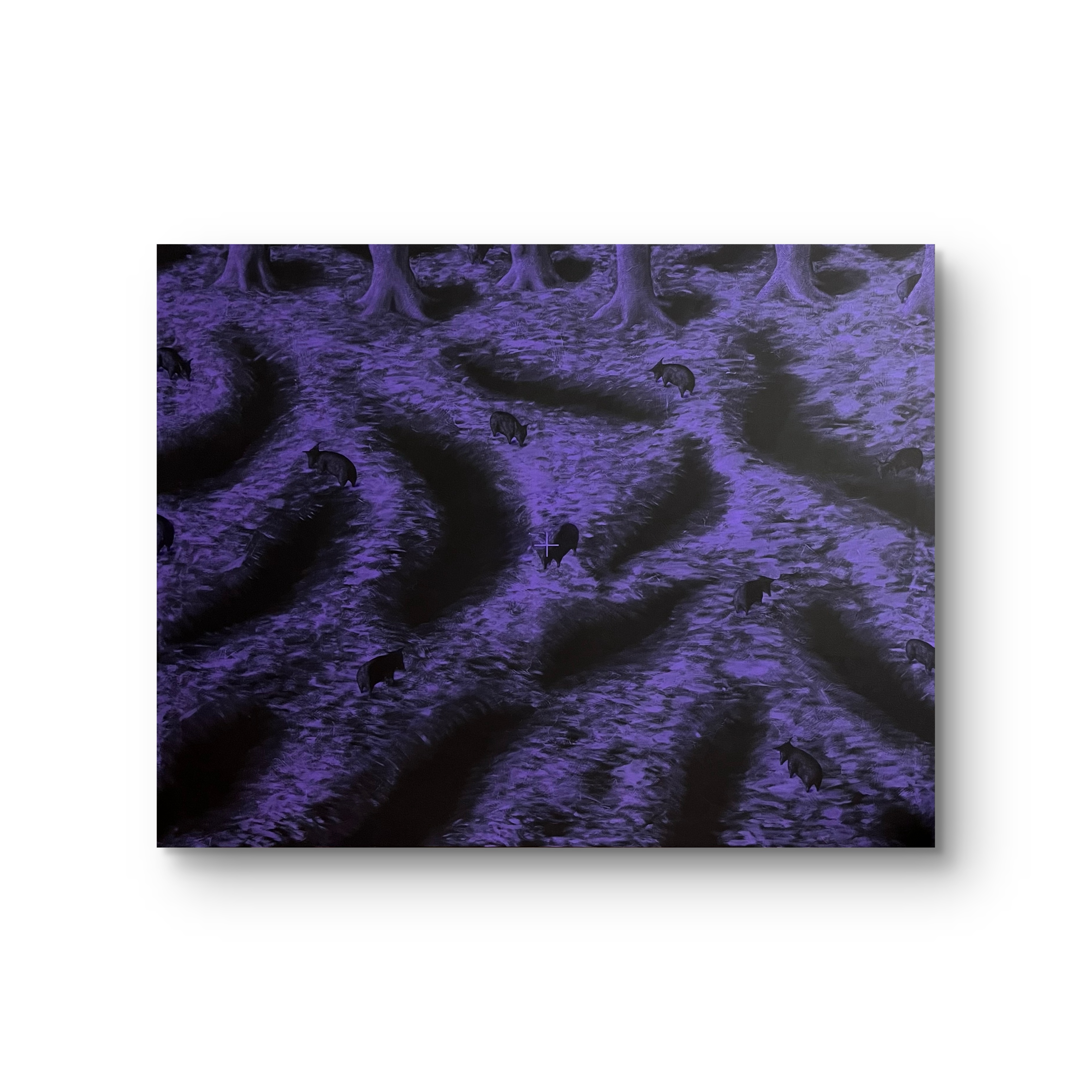 Il paesaggio tranquillo e pacato dove i maiali grufolano ha al centro della composizione un mirino. Il soggetto è preso in prestito dall’allegoria satirica di Orwell e insieme al mirino rappresenta la risposta viscerale, istintiva, al tradimento che i maiali, oligarchi, perpetrano nei confronti degli altri animali attraverso la violenza, l’inganno e la propaganda; tradimento allora della rivoluzione oggi, forse, del contratto sociale.