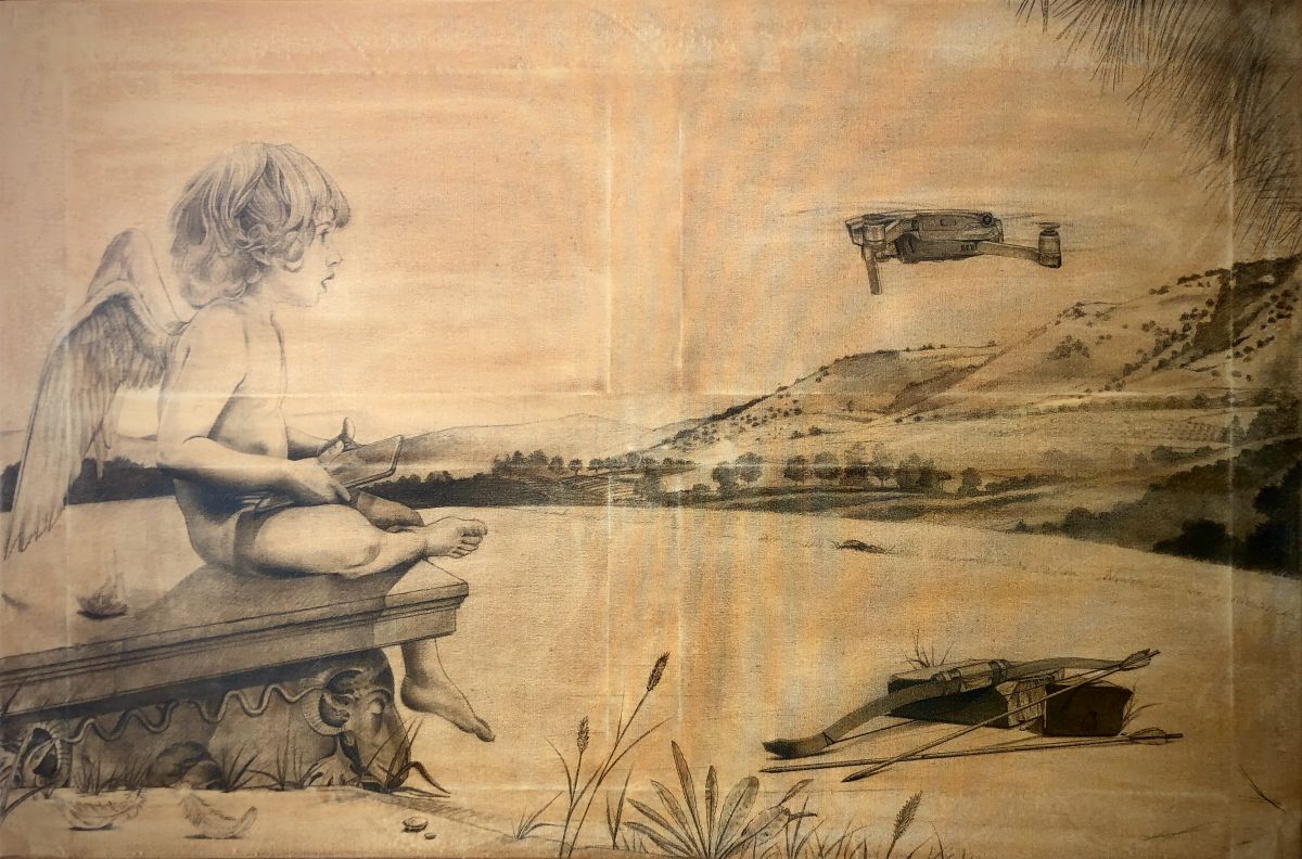Il bambino alato depone arco e frecce (suoi strumenti iconografici) per passare all’utilizzo del drone con cui potrà diffondere l’amore.