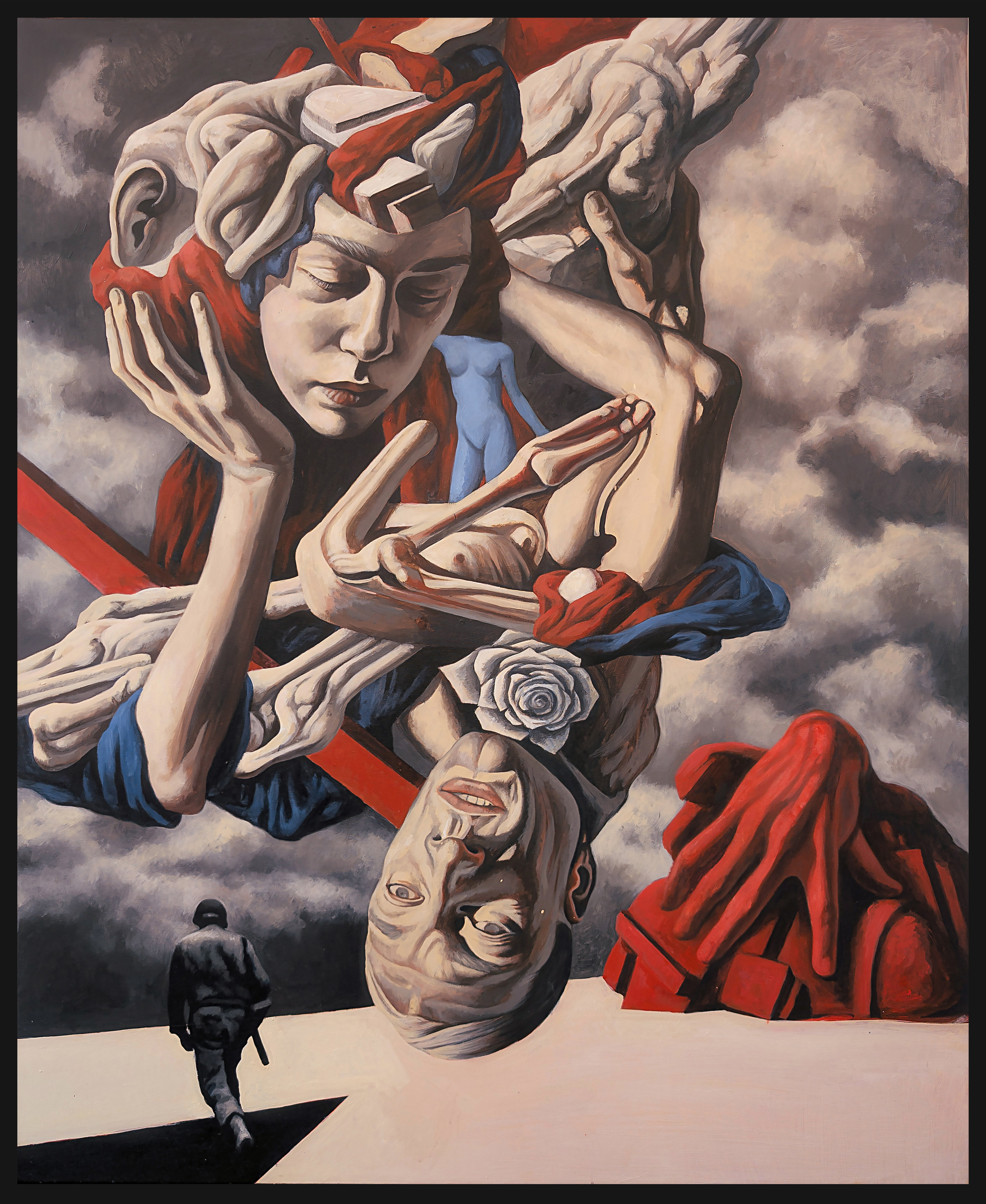 Il soldato che si allontana dalla scena introduce un elemento di estraneazione: è spettatore o carnefice? È parte del caos o la sua negazione? La sua figura diventa un’interrogazione silenziosa sul rapporto tra violenza e distanza, tra azione e memoria. L’intreccio di corpi che domina la composizione suggerisce un’umanità frammentata, intrappolata in una logica di sopraffazione e dipendenza reciproca, in cui il gesto può essere al contempo un sostegno e una costrizione.