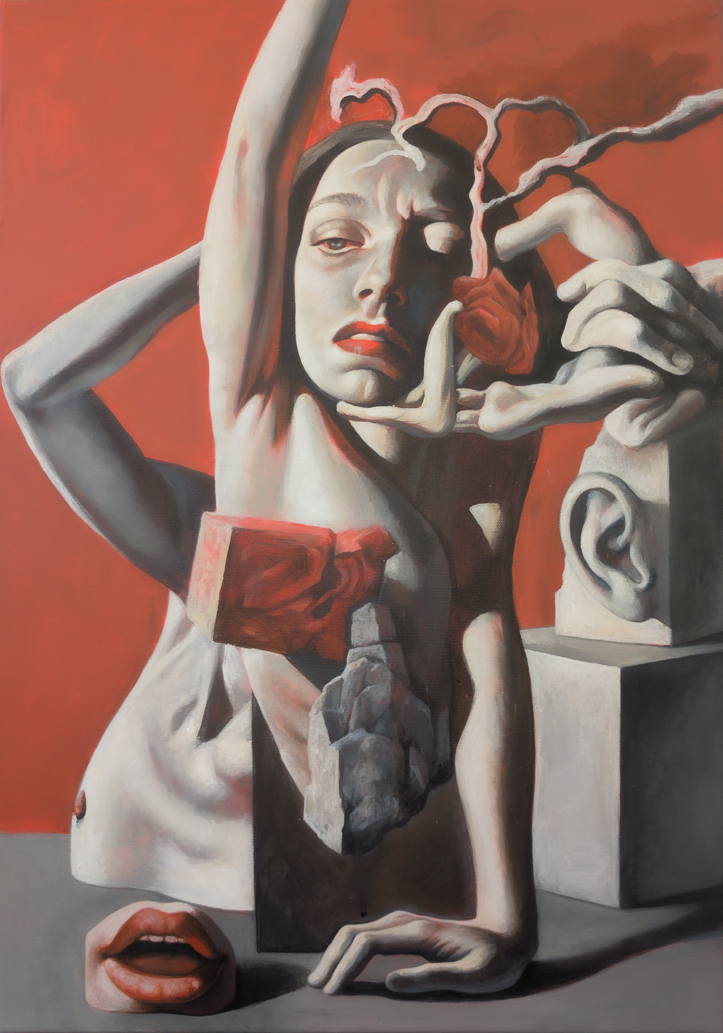 La mia ricerca artistica affonda le radici nella pittura figurativa tradizionale, ma si apre al dialogo con i linguaggi visivi contemporanei. Un aspetto centrale del mio lavoro è la fisicità delle forme che raffiguro: modellate nei minimi dettagli, talvolta al limite dell’iperrealismo, esse vengono sottratte al loro contesto abituale e ricollocate in spazi illusori. Qui subiscono processi di distorsione e ricomposizione, sospese in composizioni che sembrano al tempo stesso dinamiche e immobili.